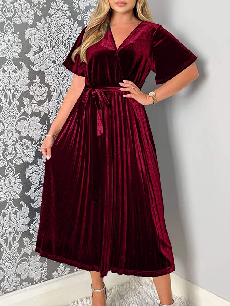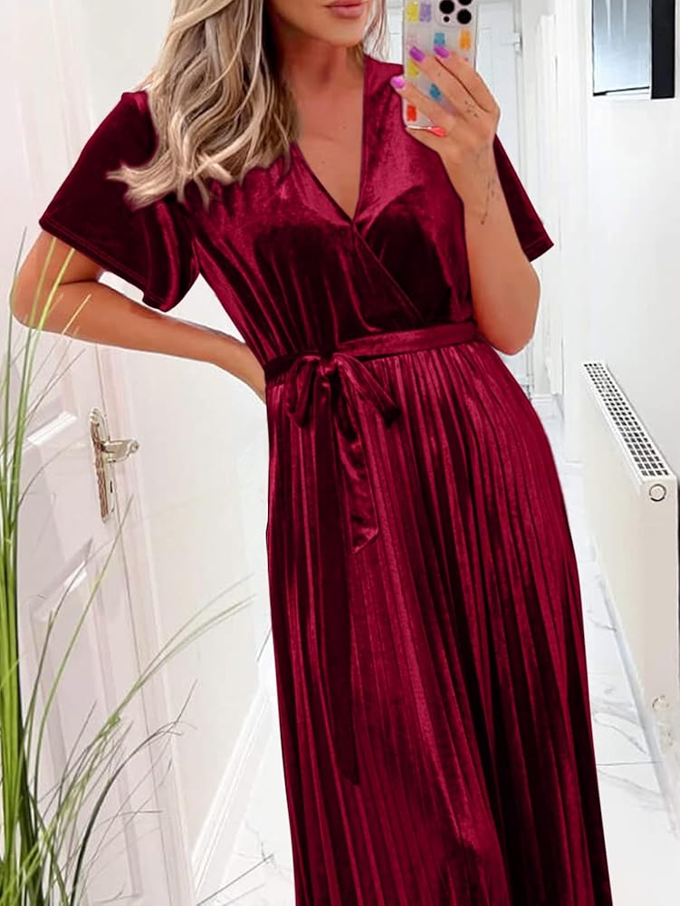 الفساتين الأنيقة مريحة للارتداء طوال اليوم. هذا الفستان المخملي الملتف مع قلادتك المفضلة يمكن أن يُظهر عظمة الترقوة الجميلة، والتصميم عالي الخصر يُظهر منحنياتك الأنثوية الرشيقة. يمكن للفستان متوسط الطول المطوي مع الخصر العالي والفستان العميق على شكل حرف V للسيدات أن يبرز منحنياتك بشكل مثالي وجذاب، وهو أمر لا بد منه في خزانة ملابسك للفصول الأربعة.