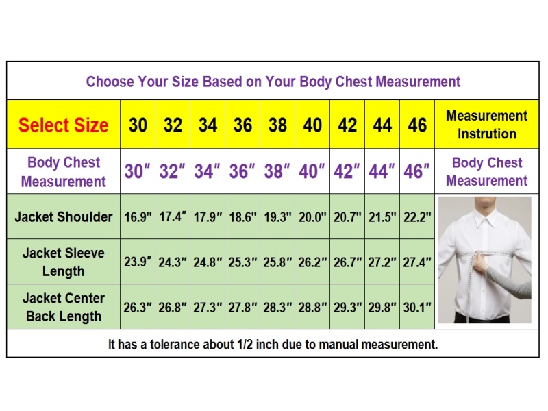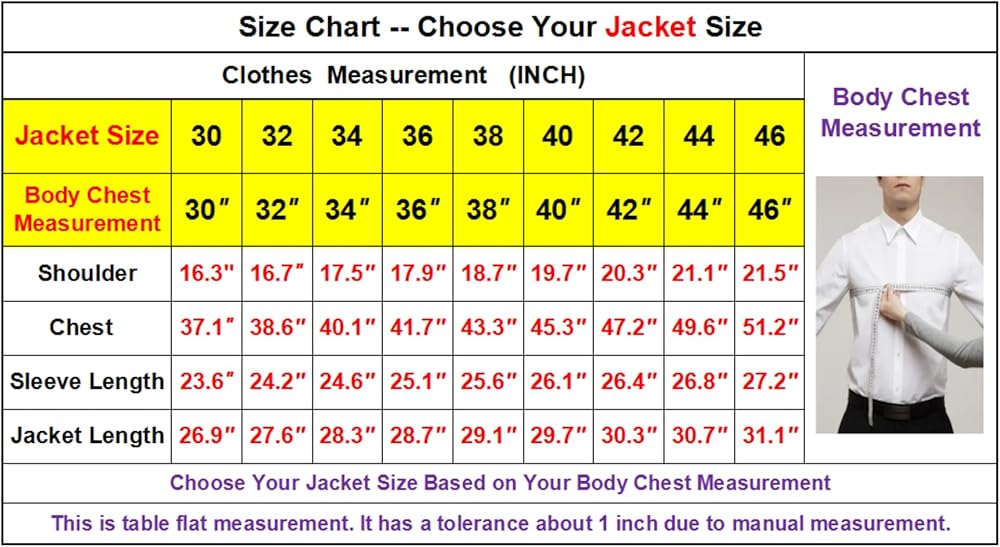 هذه سترة بدلة ذات مقاس نحيف، يرجى اختيار المقاس المناسب بناءً على مقاس صدرك من خيارات المقاسات. إذا كان مقاس صدرك 44 بوصة، فيرجى اختيار مقاس 44.