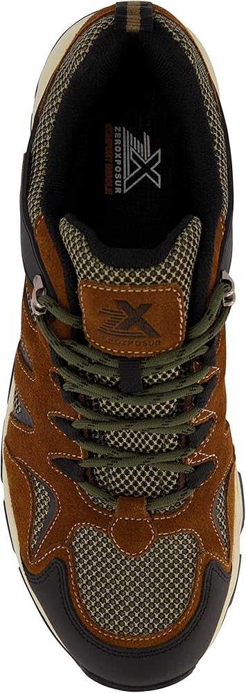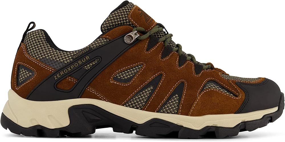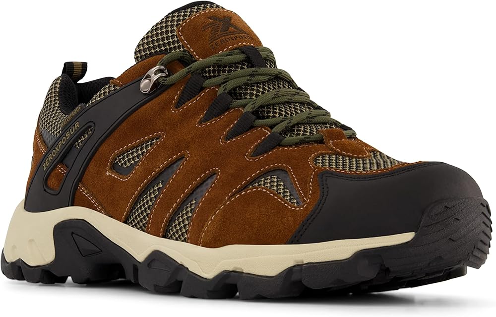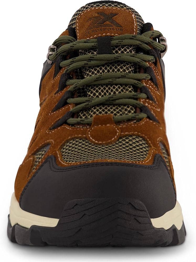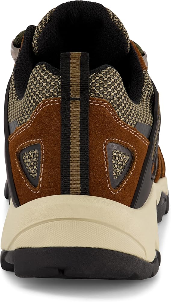 Lace-up hiking shoes have a leather and mesh upper, pull tab at the back heel, and padded collar. Low-profile hiking boots for men also have a protective bumper toe and TPR stability arm for heel stabilization.