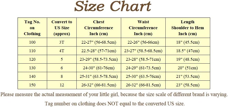 • Sizes for toddler and little girls, 3T, 4T, 5T, 6, 8, 10 and 12. Please measure the actual body size and refer to our size chart to choose a proper size for best fit. Gently hand wash with cold water.