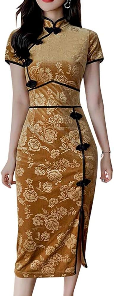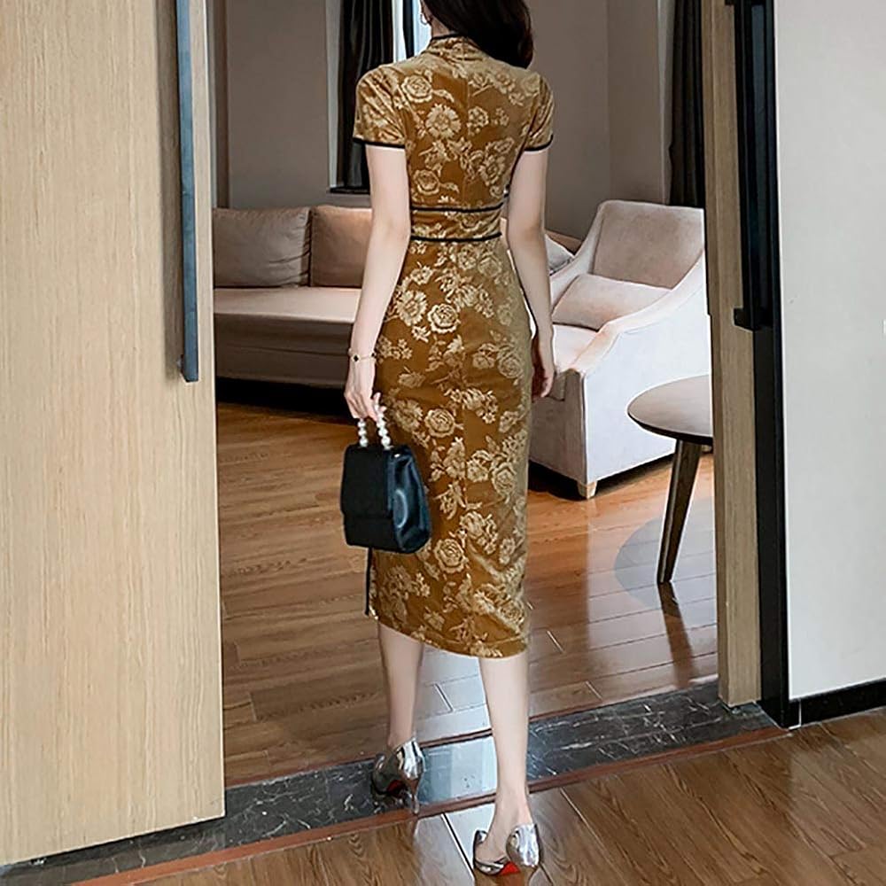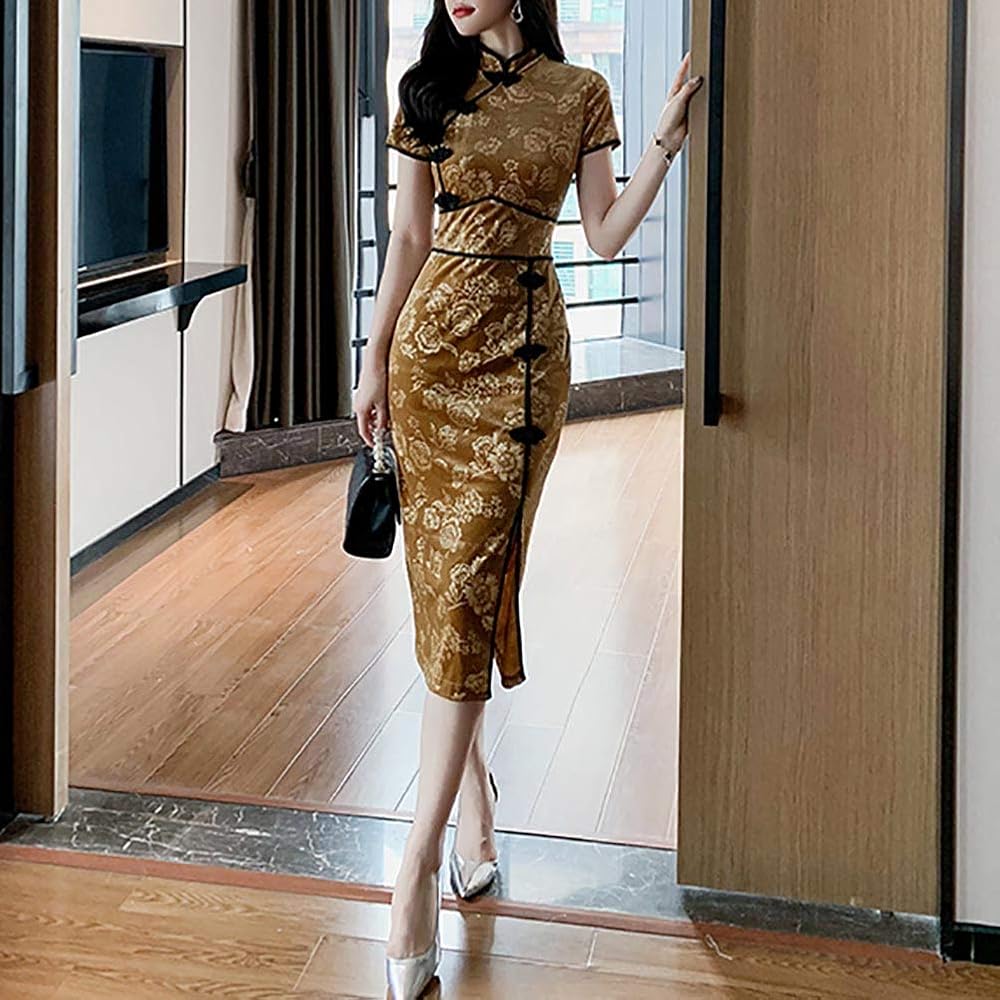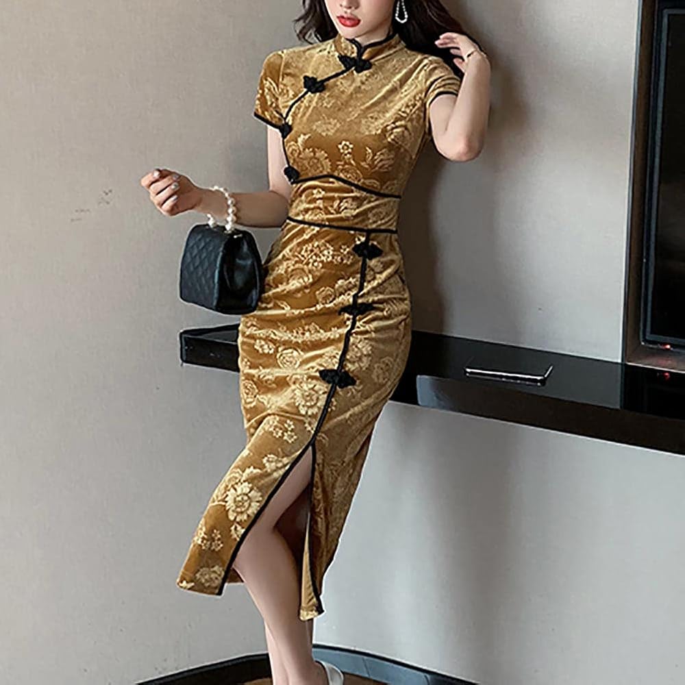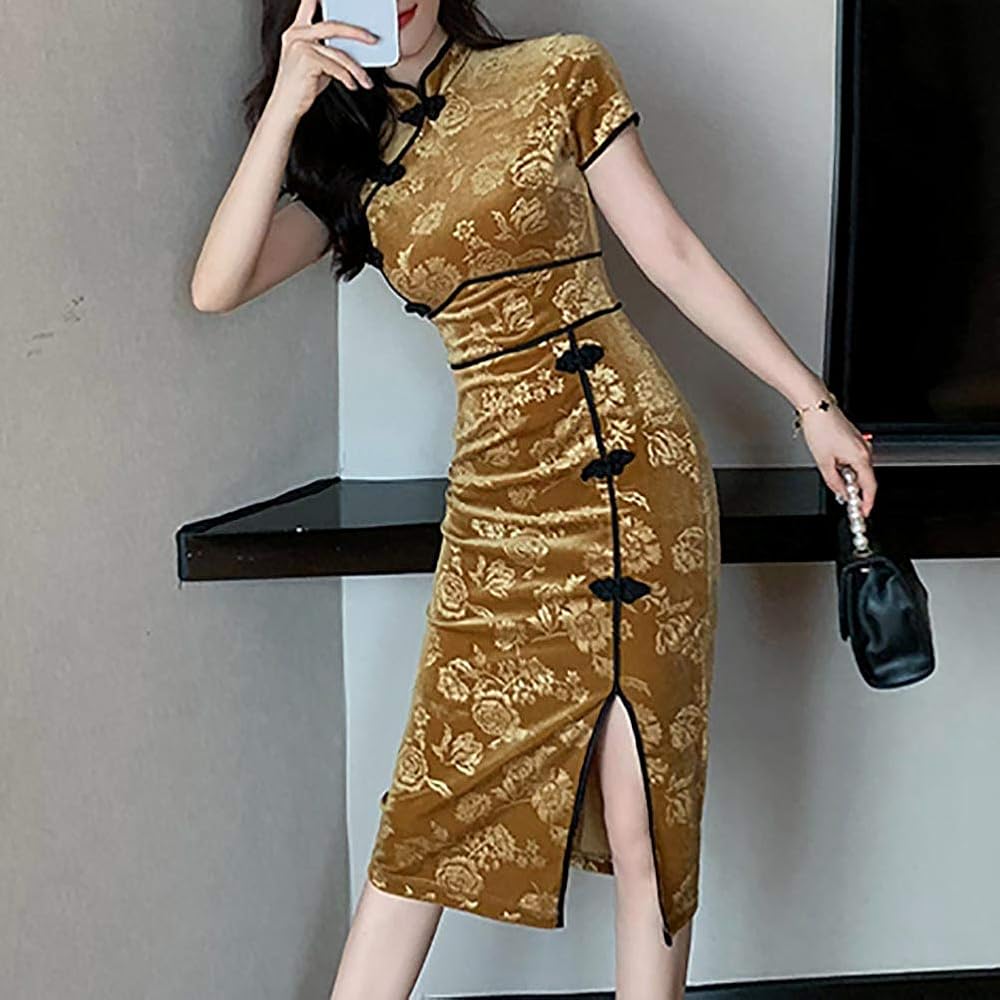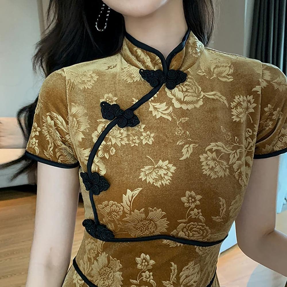 - السمات: ياقة واقفة على الطراز الصيني الكلاسيكي وأكمام طويلة، فستان شيونغسام بمقاس نحيف. لون ثابت، ناعم، خفيف الوزن، زر ضفدع، فتحة جانبية.