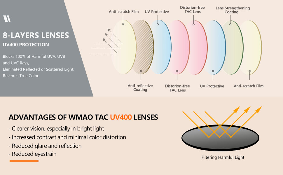 العدسات المستقطبة: تعمل العدسات المستقطبة على تقليل الوهج وتعزيز الوضوح البصري، مما يسمح لك بالرؤية بوضوح حتى في ضوء الشمس الساطع أو الأسطح العاكسة.