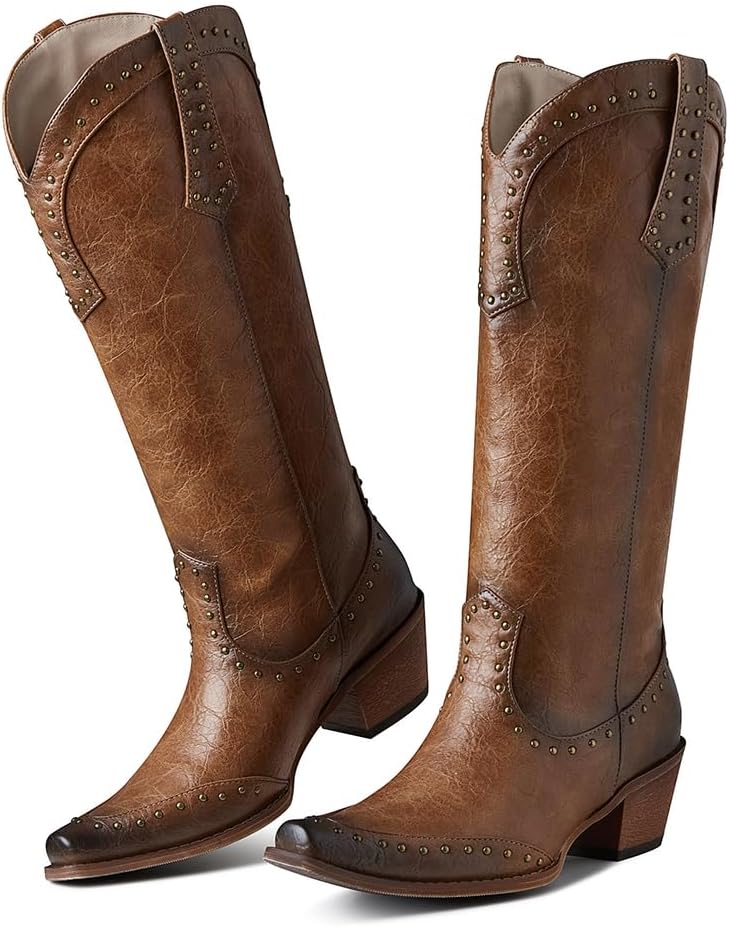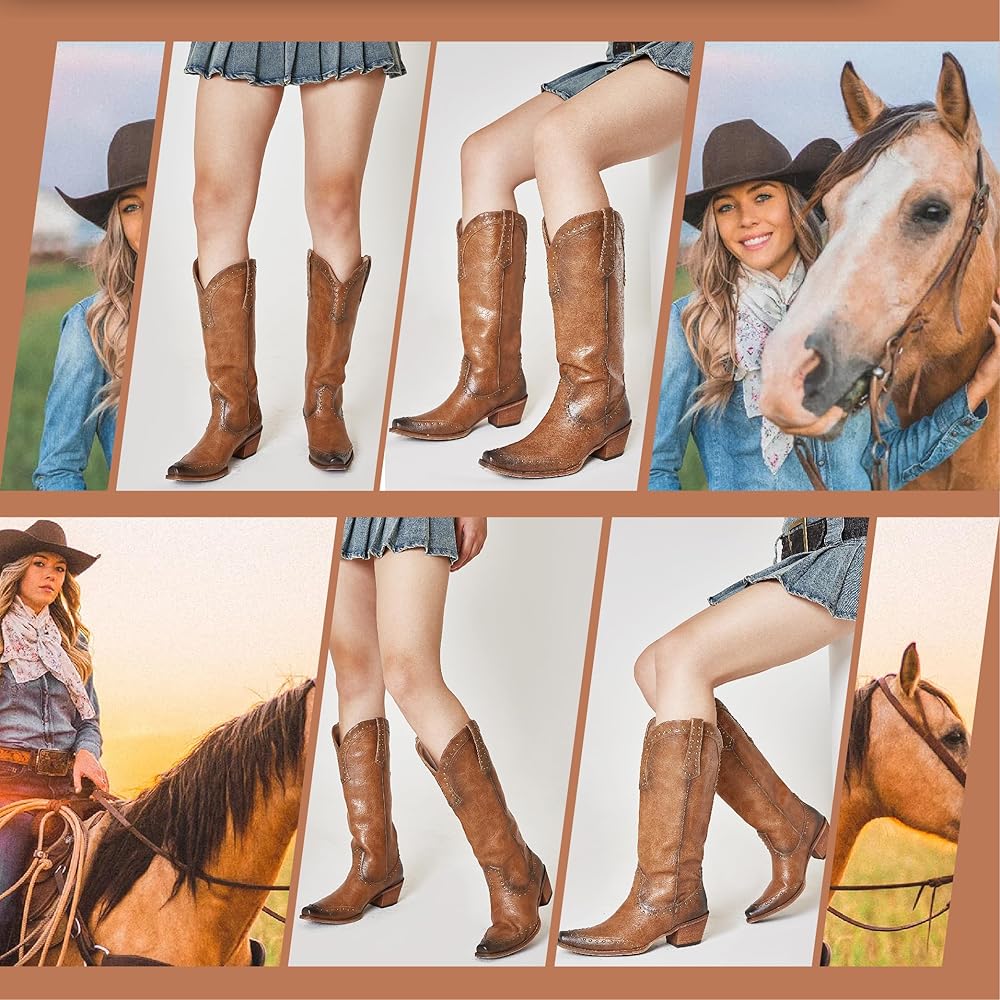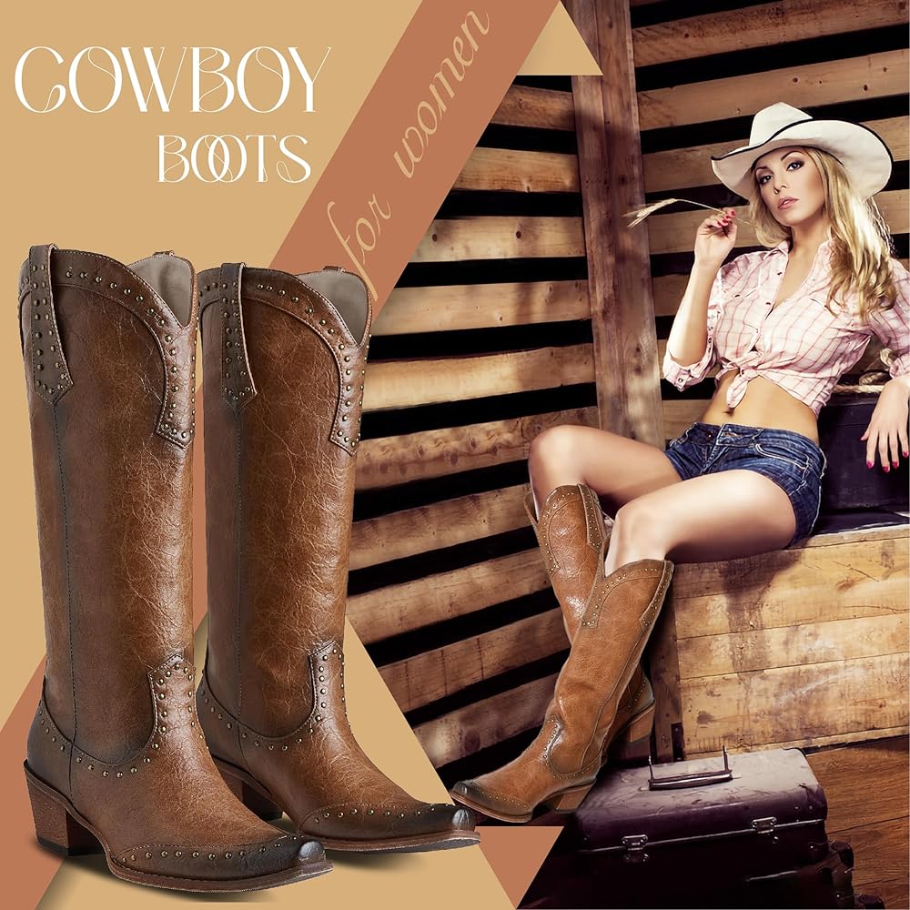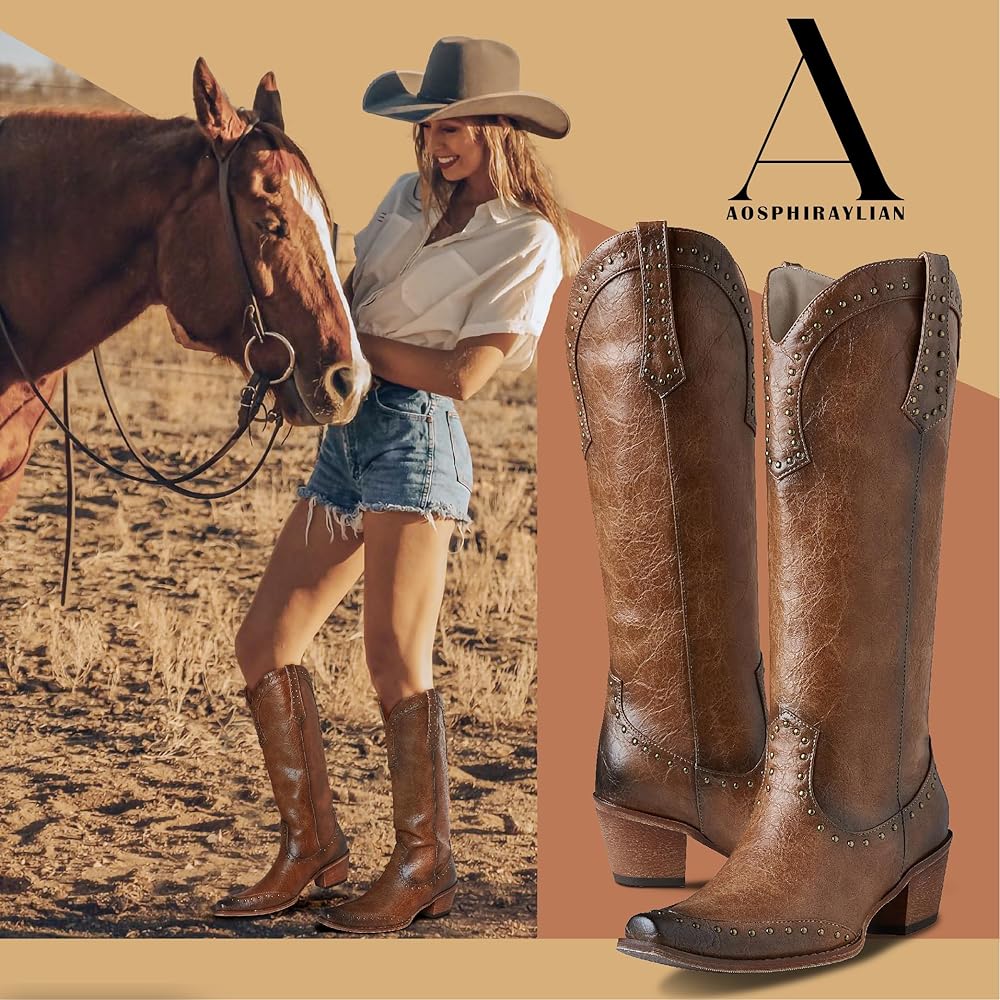 AOSPHIRAYLIAN أحذية رعاة البقر للنساء اللوز وأشار اصبع القدم أحذية عالية في الركبة سحب على كعب مكتنز مرصع أحذية راعية البقر الغربية الأزياء الرجعية حزب اللباس الأحذية