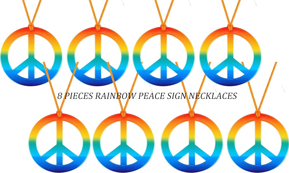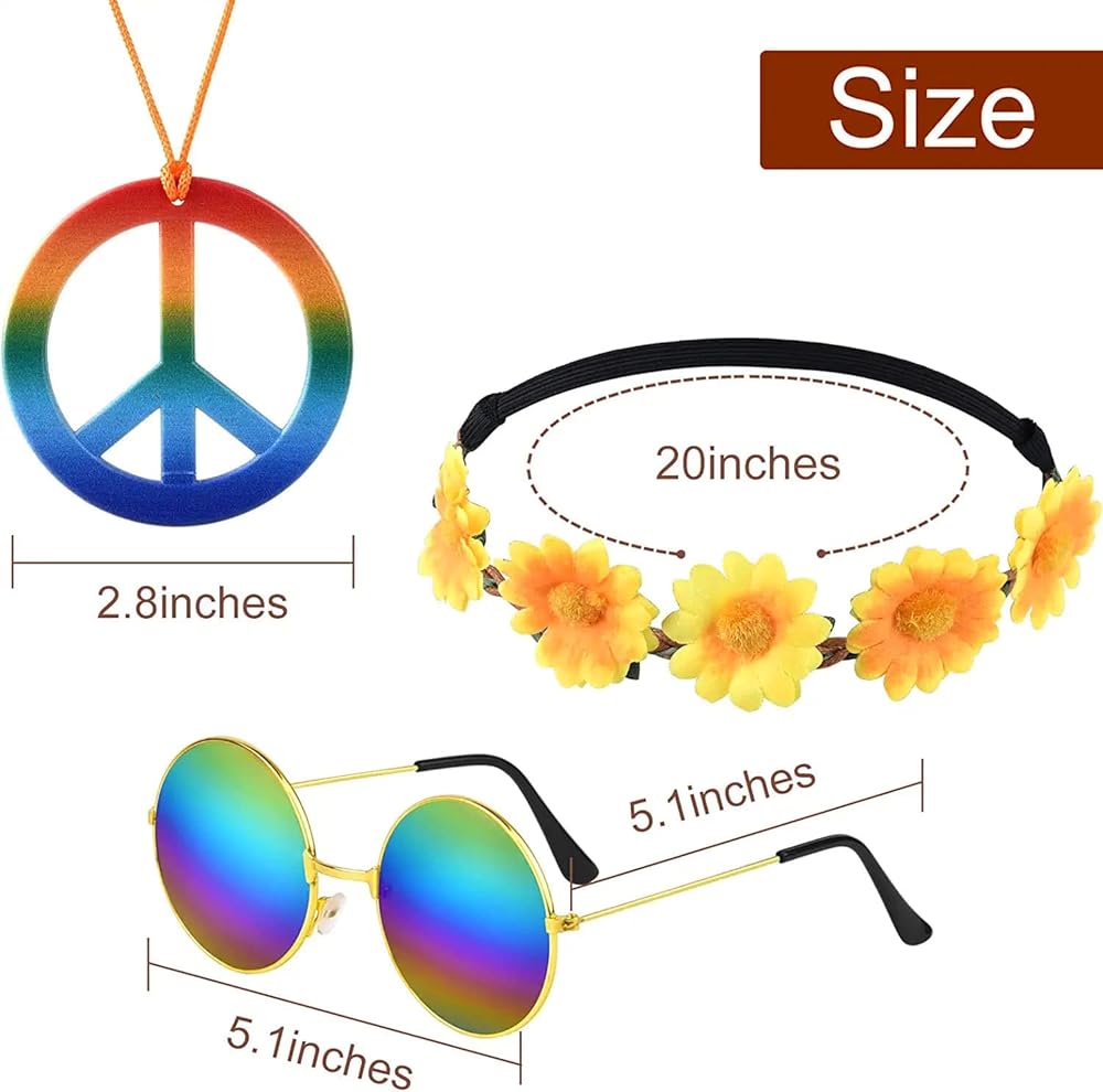 تشمل العبوة: 8 عصابات رأس ديزي، 8 قلادات تحمل علامة السلام بألوان قوس قزح، 8 أزواج من نظارات هيبي الشمسية المستديرة بحدود ذهبية و50 قطعة من ملصقات السلام العالمية، زي مطابق؛ ملونة ونابضة بالحياة، يمكنك مشاركة هذه المجموعة المبهجة من إكسسوارات الهيبي مع الأصدقاء والعائلة وقضاء وقت ممتع