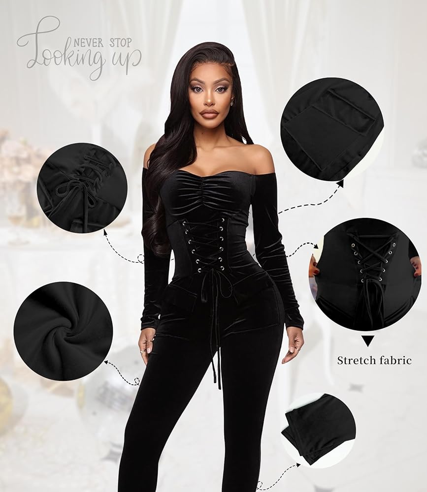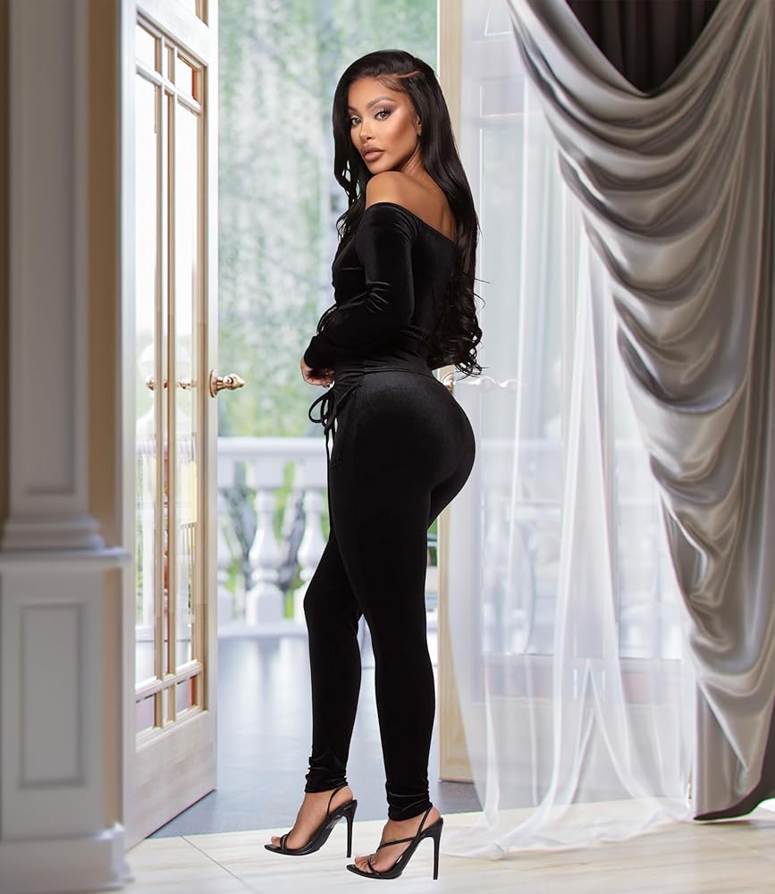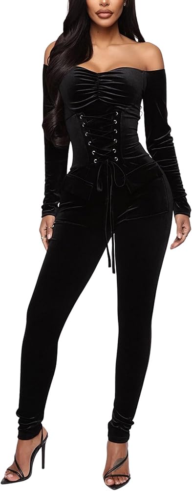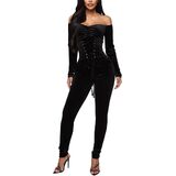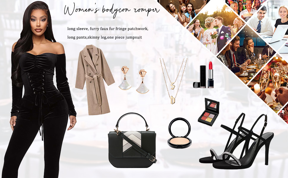السمات: بذلة نسائية سوداء، منفوشة بدون أكتاف، أكمام طويلة، رقعة من الفرو الصناعي، سراويل طويلة، ساق ضيقة، بذلة من قطعة واحدة، ملابس لعب عالية الخصر، لون موحد، ملابس الشارع، ملابس الحفلات، ملابس النادي، ملابس غير رسمية لحفلات الزفاف الليلية .