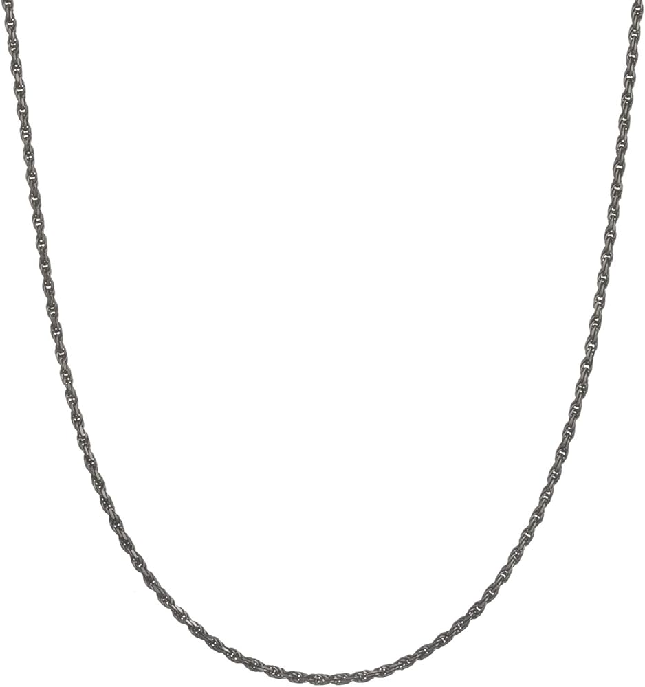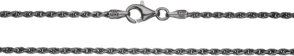 This shimmering 1.6mm rope chain necklace is durable, yet lightweight and comfortable to wear. It is made in Italy with the finest standards of craftsmanship, using only solid 925 genuine sterling silver with a black rhodium flashed color. The diamond-cut design makes this chain shimmer and sparkle in the light. Each chain is stamped 925 and ITALY for authenticity. Our chains are imported directly from Italy, allowing us to offer you the lowest prices. This chain is secured with a heavy-duty lobster claw clasp, which is more durable than the standard spring ring clasp used in other chains. It's available in several sizes from 16" - 30". Select your desired length from the drop down list.