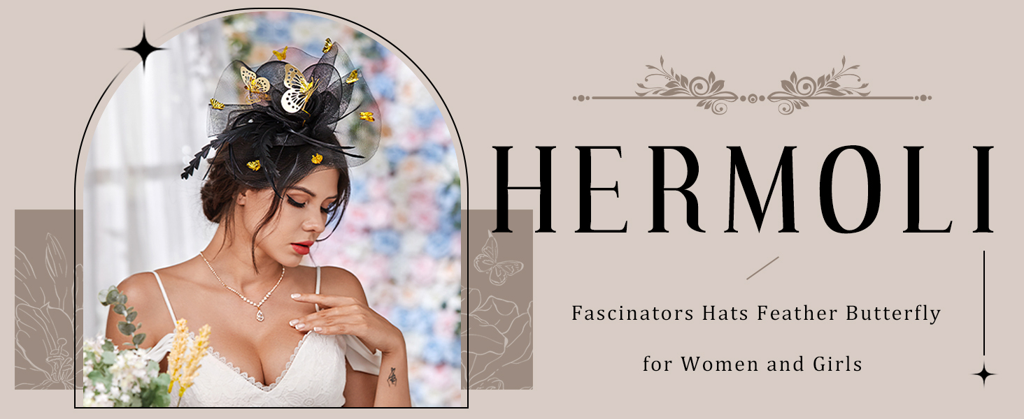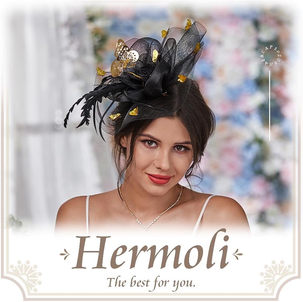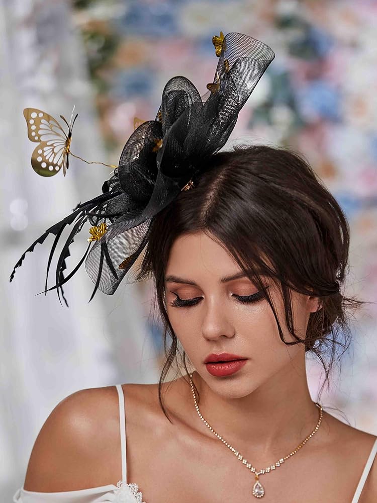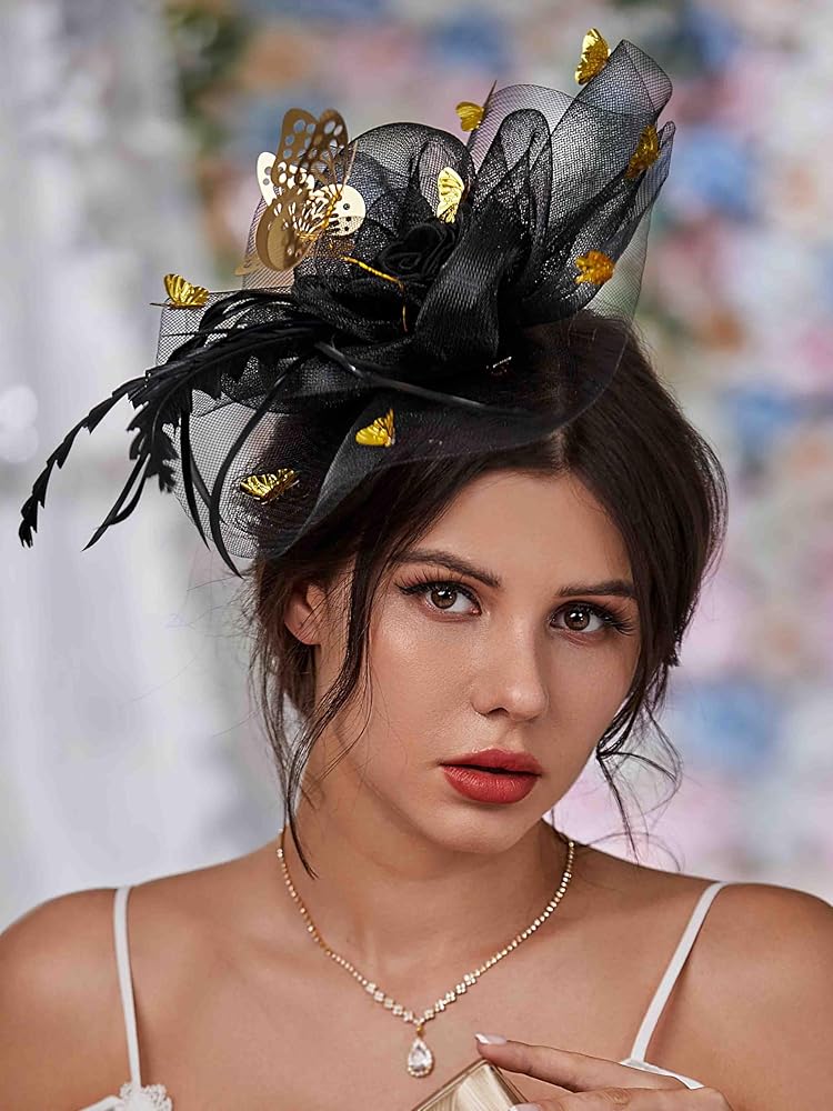 قبعات هيرمولي فاسيناتورز، ريش فراشة شبكية، زهرة سوداء وذهبية لحفلات الهالوين وحفلات الشاي للفتيات