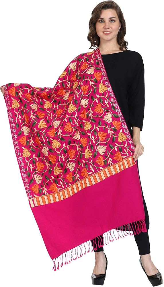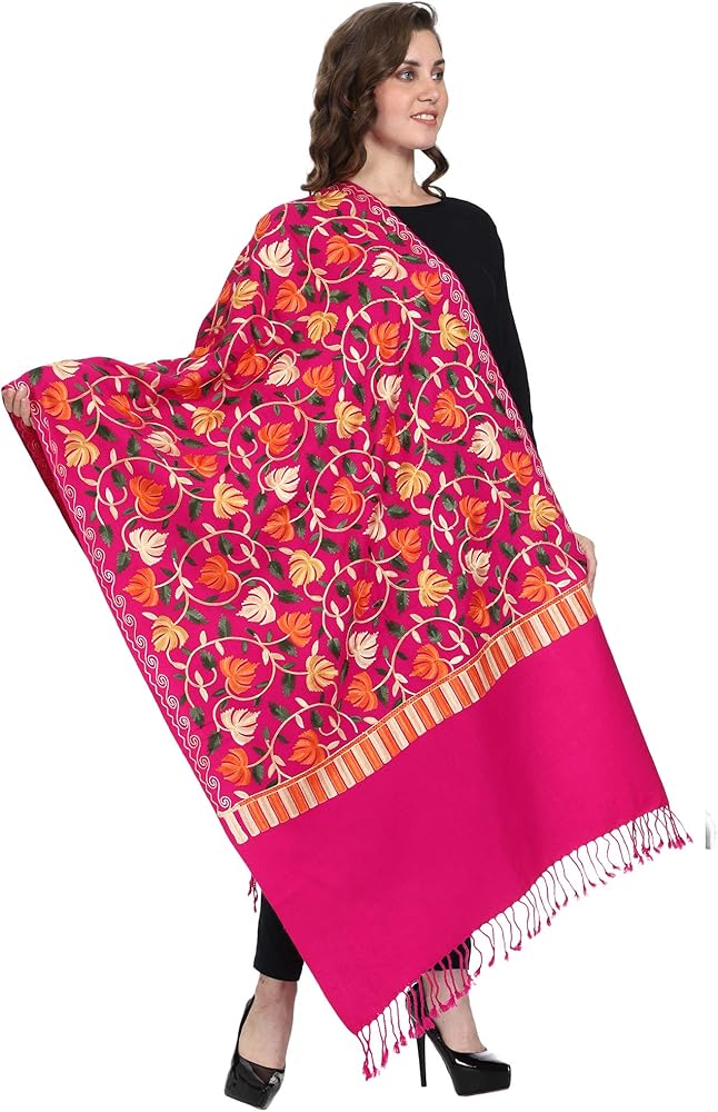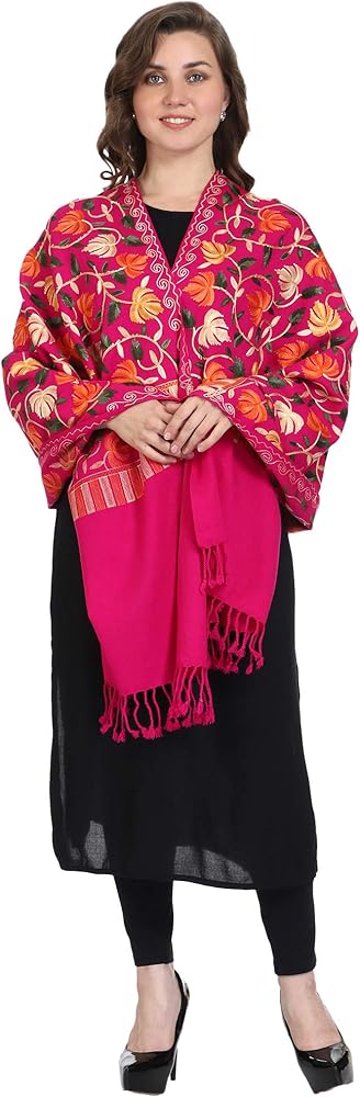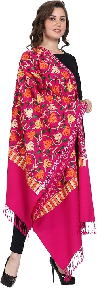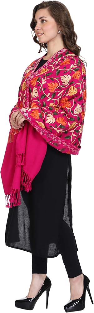 This ethereal piece is a blend of vibrant colours and ethnic design. The woollen base is bound to keep you cozy. The aari embroidery is a cultural pride of Kashmir and is adding to the grace of this shawl. Stylish uses the most exceptional quality of wool to bring you the best experience of adorning its products. Our yarn and fabrics are processed using organic extracts that do not harm the environment. At Stylish we are committed to quality and keep environmental health at paramount importance. We bring the most sought-after styles in intricate embroidery to satisfy your taste for rich and graceful wraps.