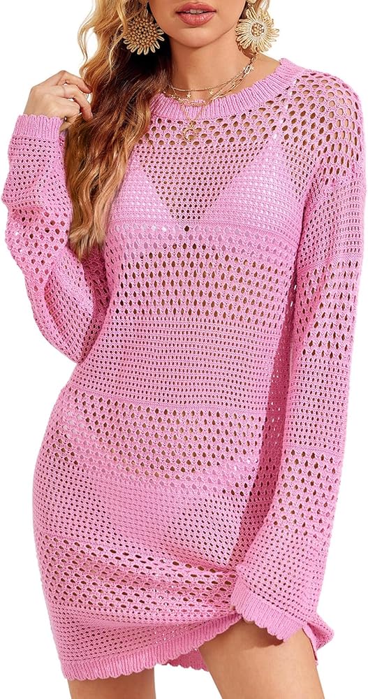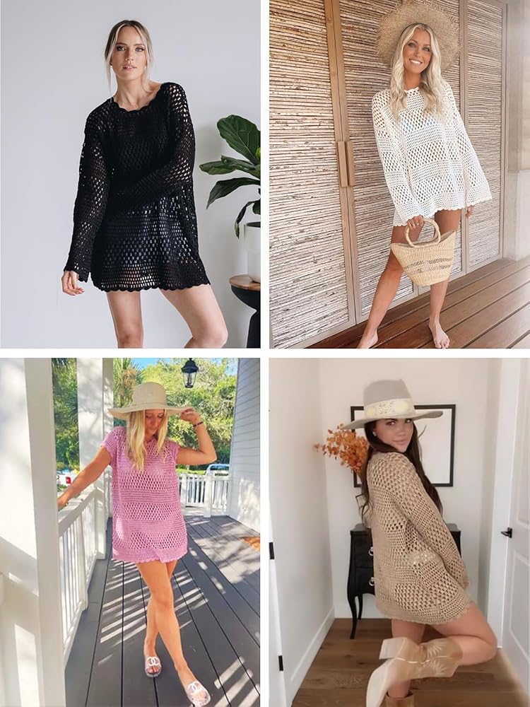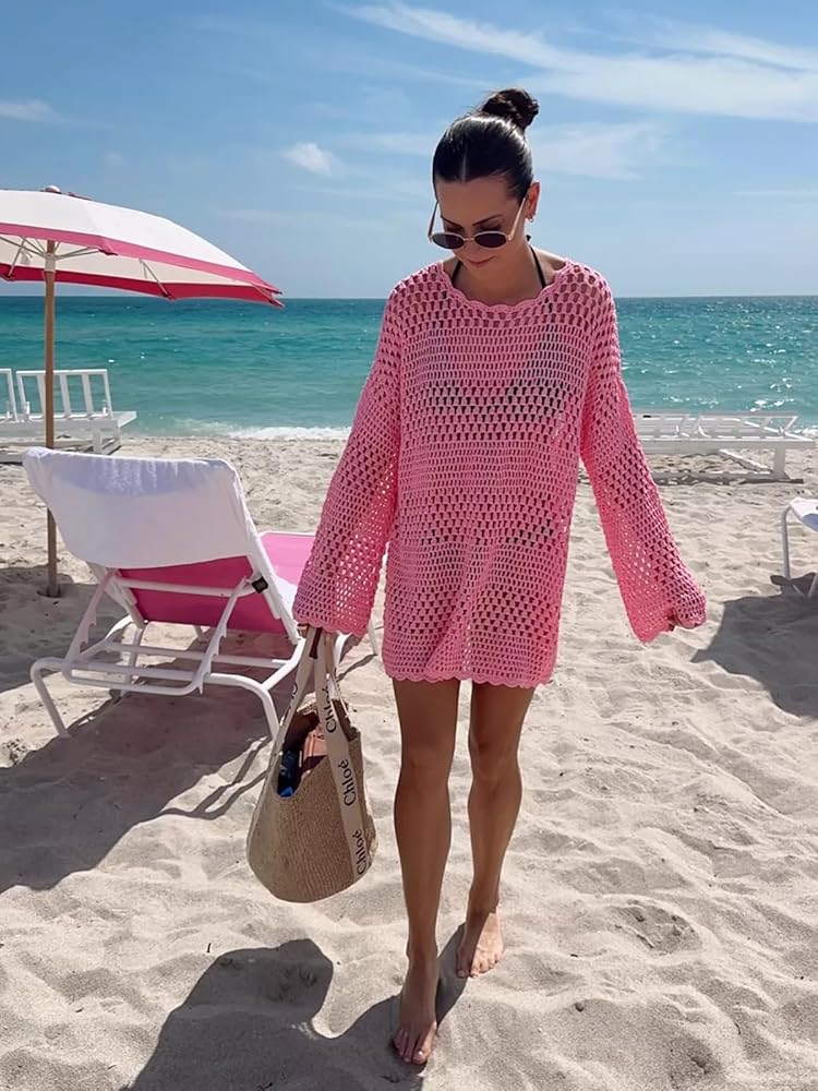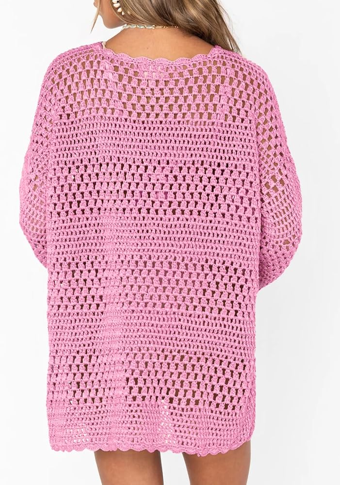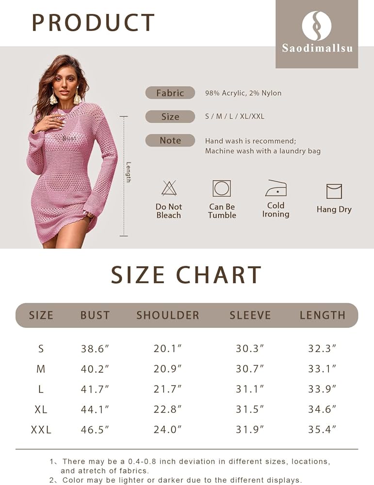 المزايا - تصميم فستان سباحة كروشيه بأكمام جرس طويلة، لون ثابت، مقاس فضفاض كبير الحجم، تفاصيل شبكية مقصوصة تجعل أغطية بدلة السباحة هذه أكثر أناقة، بلوفر كلاسيكي برقبة دائرية وفساتين قصيرة للشاطئ مع حاشية مكشكشة