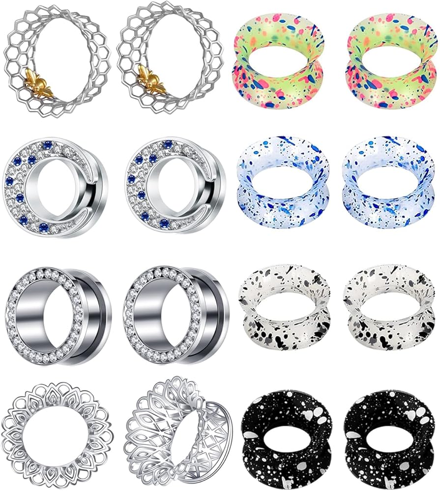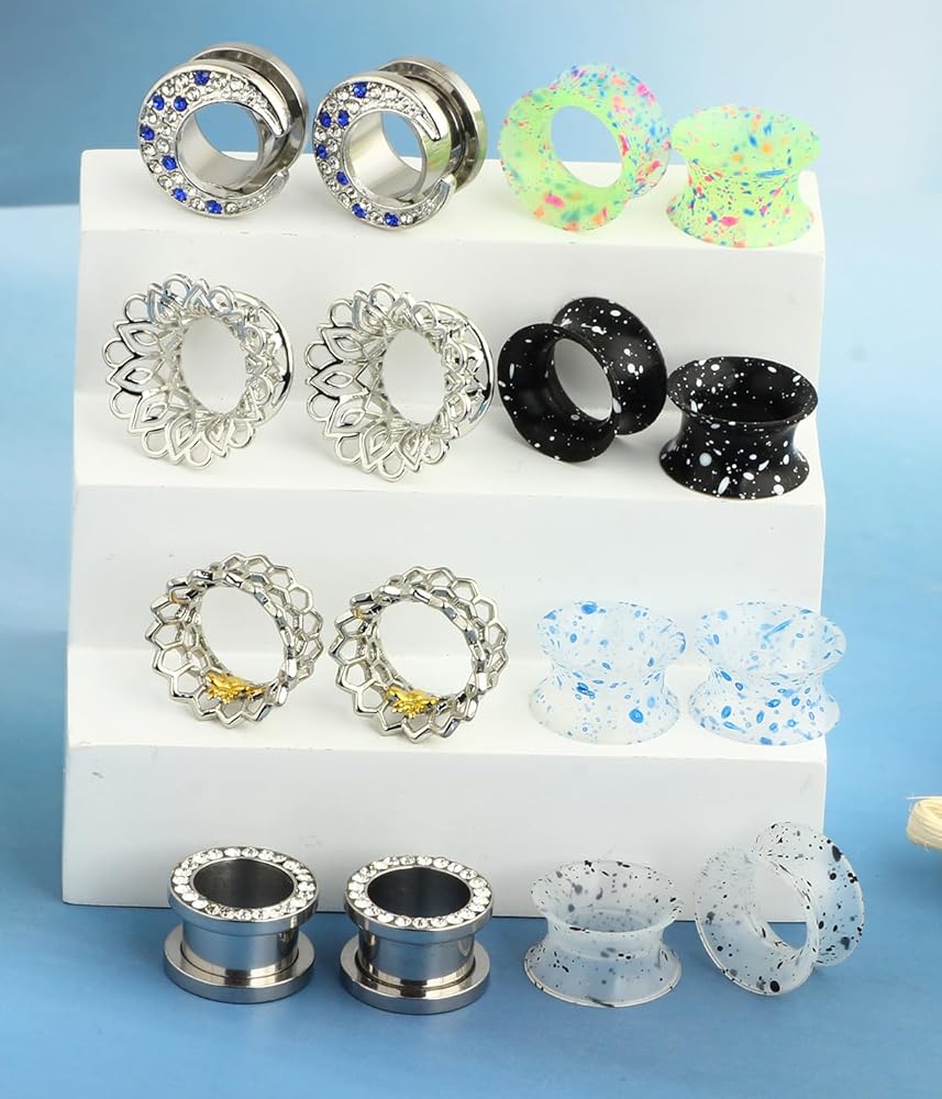 عبوة قيمة رائعة مكونة من 8 أزواج من أنفاق الأذن المذهلة بأنماط مختلفة، تشمل الفضي والأسود. ارتداء مختلف كل يوم!