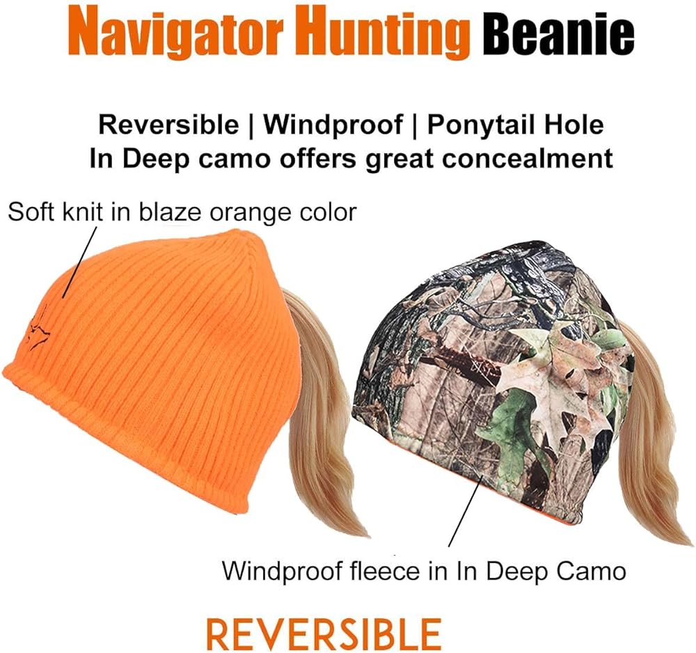 قبعة صغيرة عالية الأداء مصممة للنساء - قبعة نافيغايتور ذات وجهين، مقاومة للرياح وتوفر دفئاً رائعاً. يوجد فتحة لذيل الحصان في الظهر. إنه واحد من أكثر الألعاب دفئًا وراحة للصيادين من الإناث