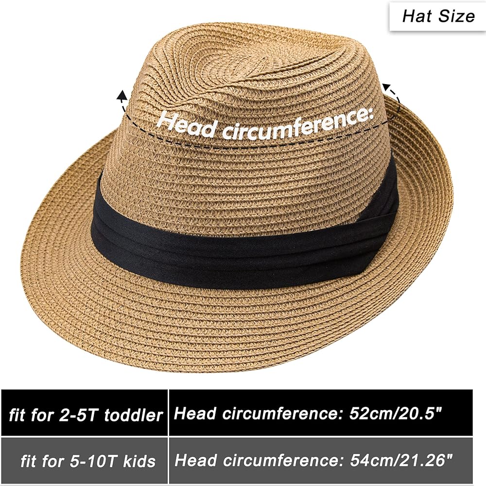 Kids Fedoras Hat: Head circumference: 52 cm /20.5" fit for 2-5T toddler boys and girls, Head circumference: 54cm/21.26" fit for 5-10 years boys and girls.Please measure the circumference of your child's head before order.