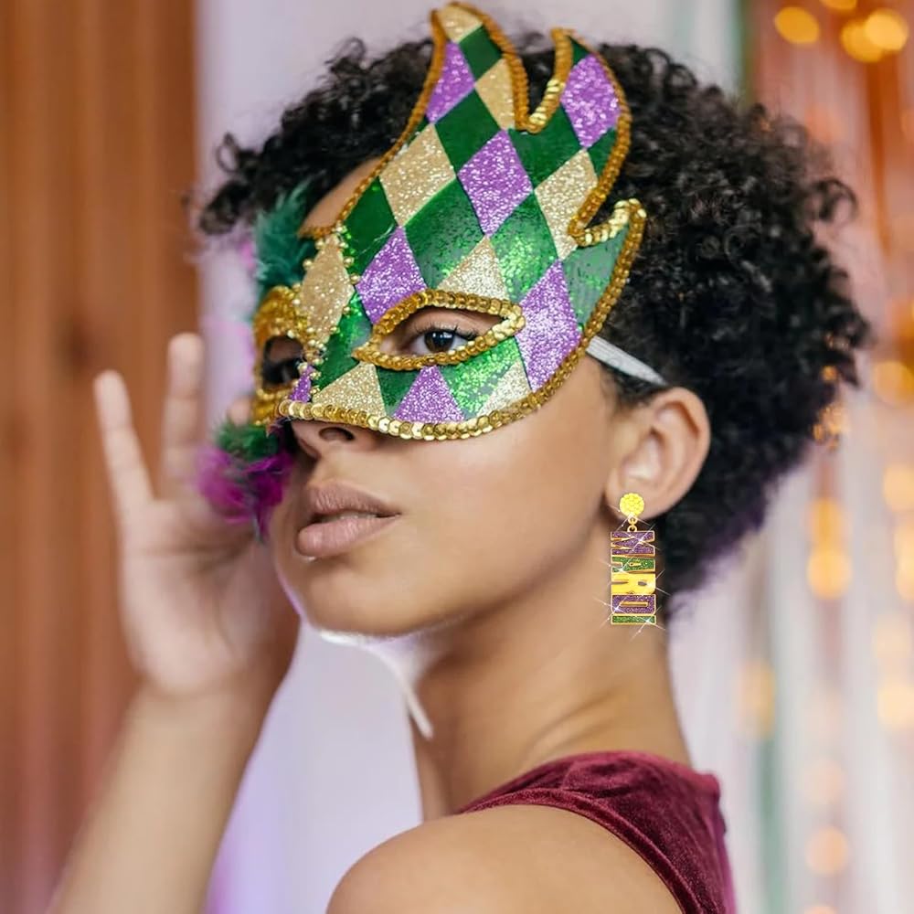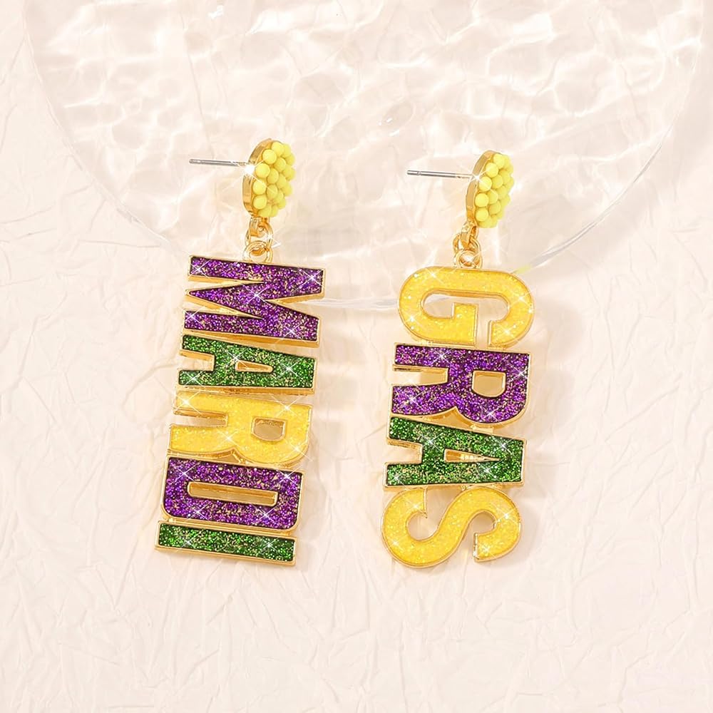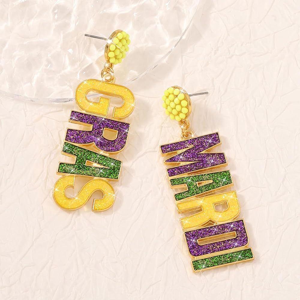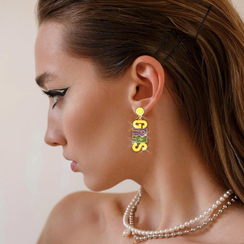 💖【أقراط ماردي جراس】يعني ماردي جراس المسيرات الملونة والرقص والأزياء اللامعة والكرات الفاخرة. الكرنفال هو الوقت المناسب في لويزيانا عندما يُسمح لنا بالجنون قليلاً مع ملابسنا وإكسسواراتنا، وأقراطنا الرائعة تناسبك مثل أميرة ترتديها في يوم العرض! يُقال إن الألوان التقليدية لـ Mardi Gras هي الأرجواني والأخضر والأصفر تمثل العدالة والإيمان والقوة على التوالي. احتفل بقلبك أثناء ارتداء أقراط Mardi Gras الممتعة هذه!