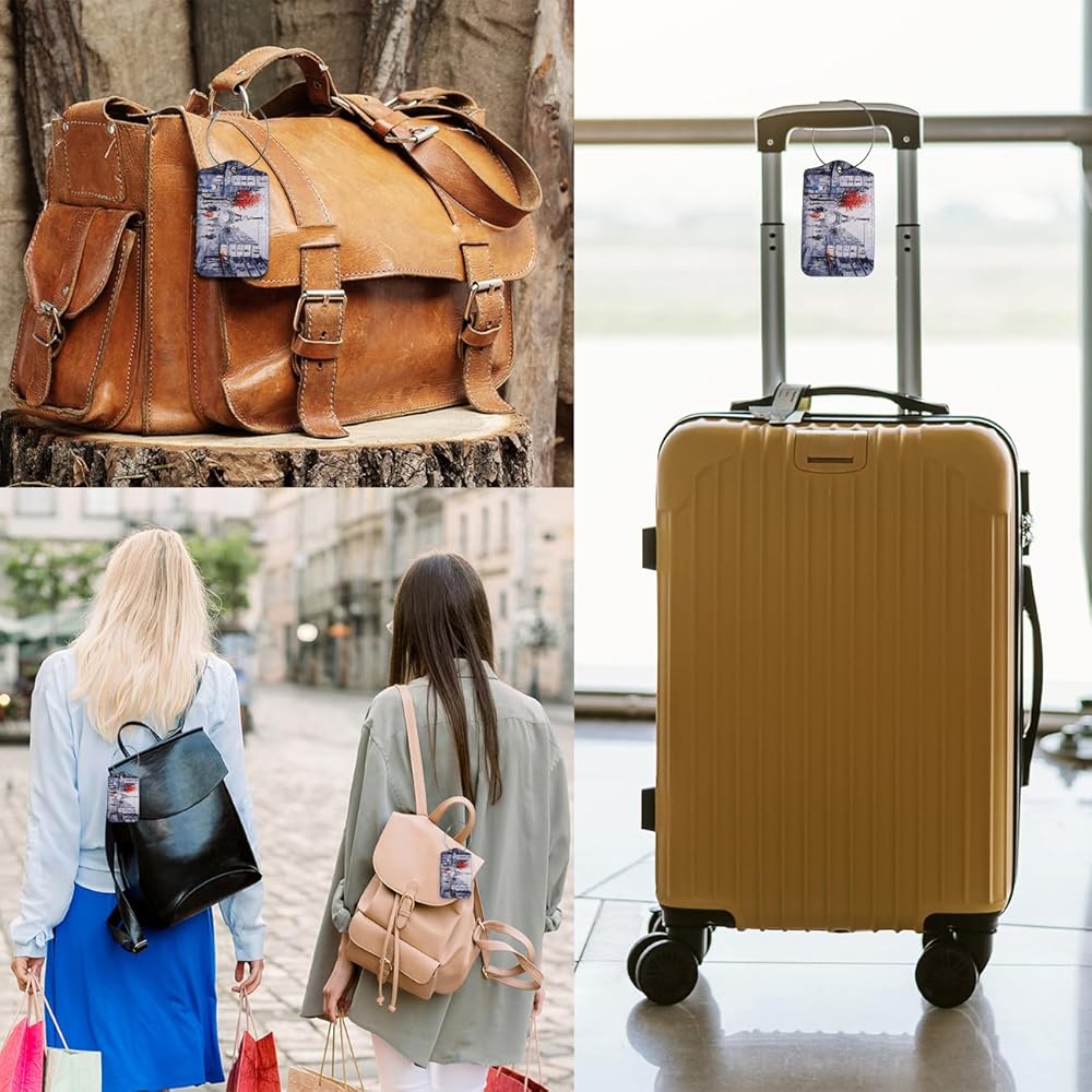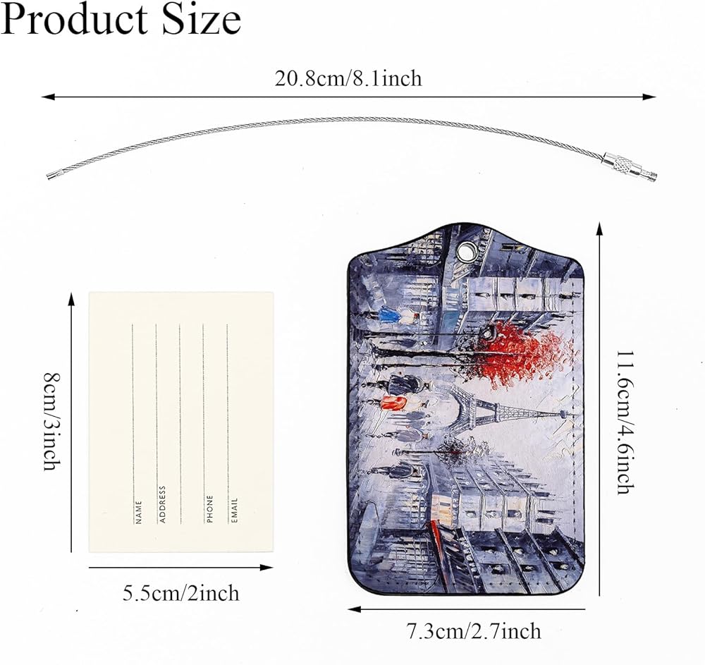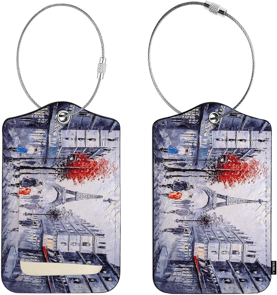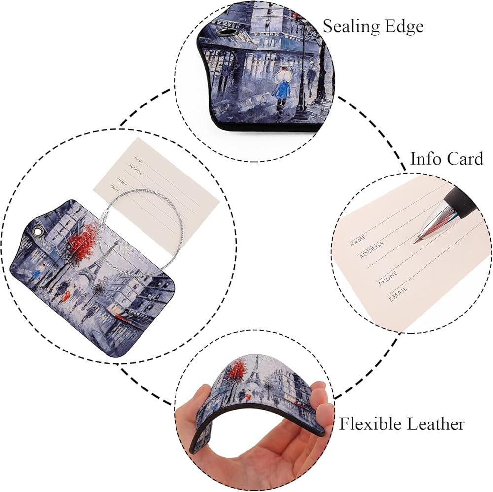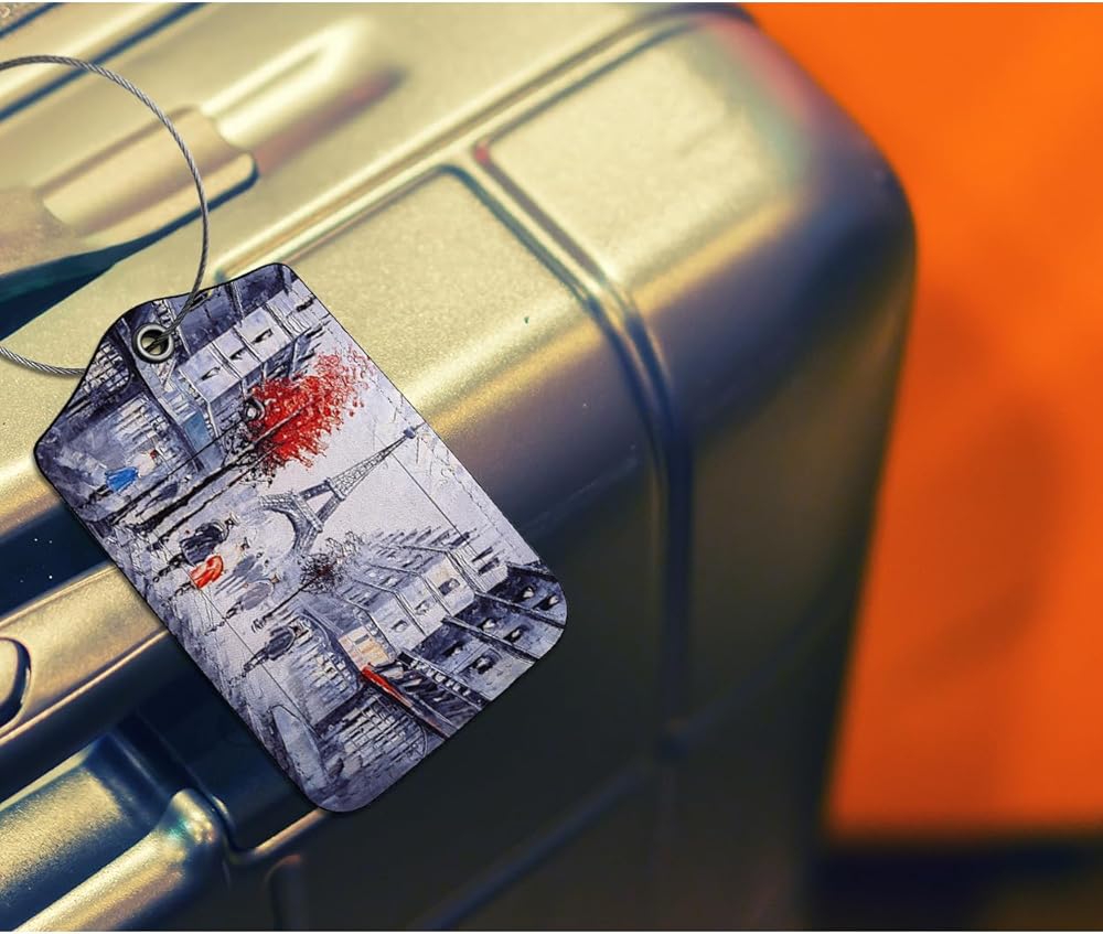 EKOBLA معرف علامة الأمتعة لوحة زيتية منظر الشارع لباريس الفرنسية بناء حماية الخصوصية ملصق حقيبة السفر لأمتعة الحقائب، قطعة واحدة من علامات الأمتعة مع حلقة من الفولاذ المقاوم للصدأ وبطاقة هوية الاسم