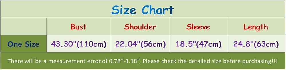 One Size : Bust 43.30"(110cm) , Shoulder 22.04"(56cm) ,Sleeve 18.5"(47cm) , Length 24.8""(63cm)