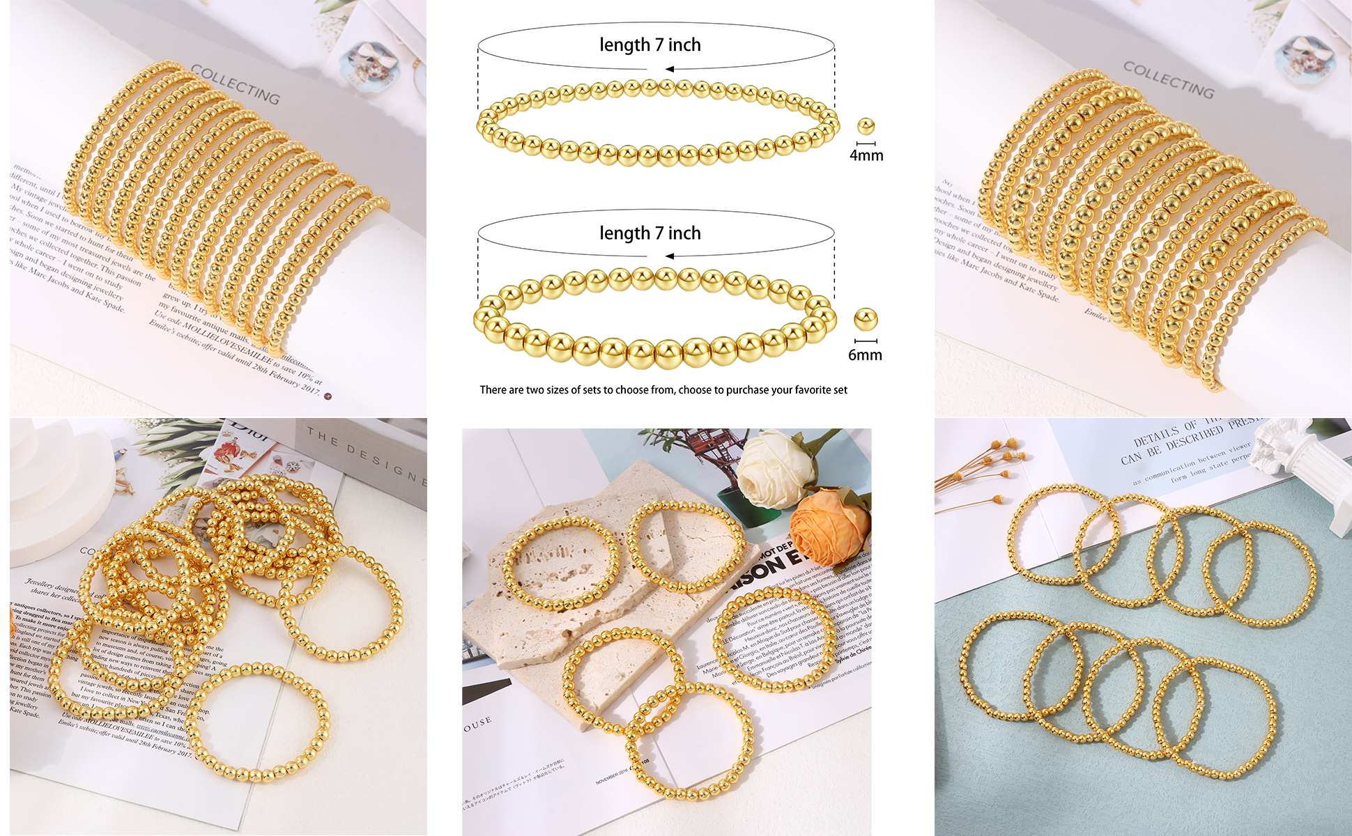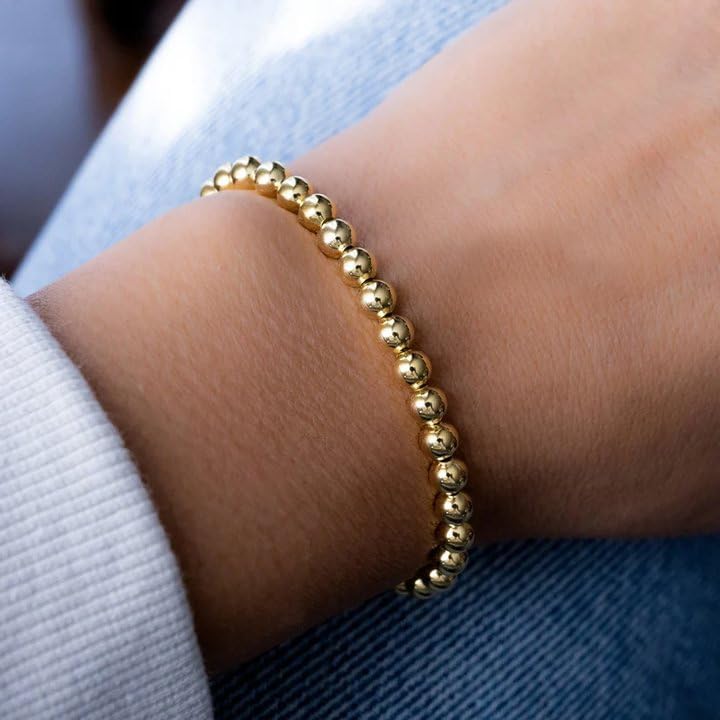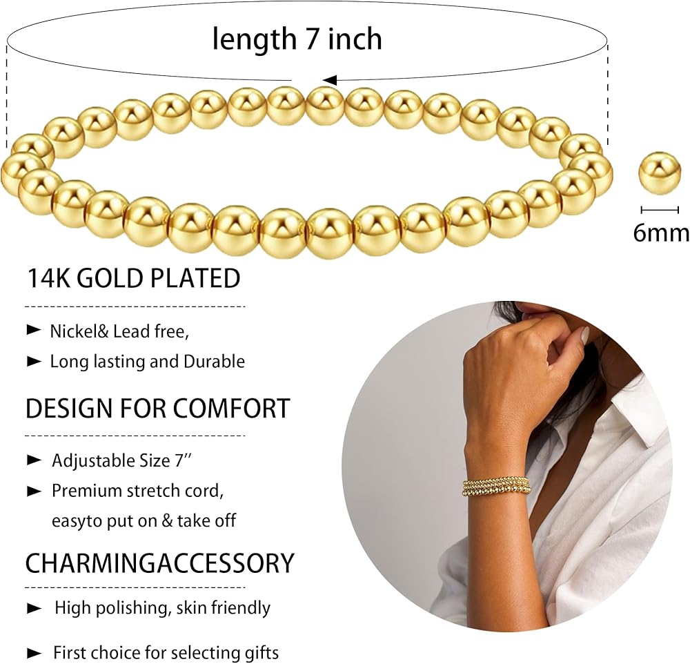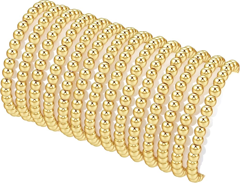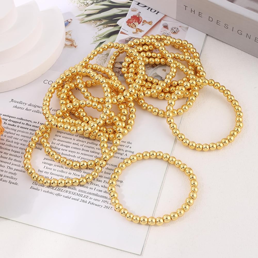 【أنماط جذابة على الموضة】مجموعة أساور خرز ذهبية تحتوي على 4 قطع أساور خرز 6 مم، 10 قطع أساور خرز 4 مم.