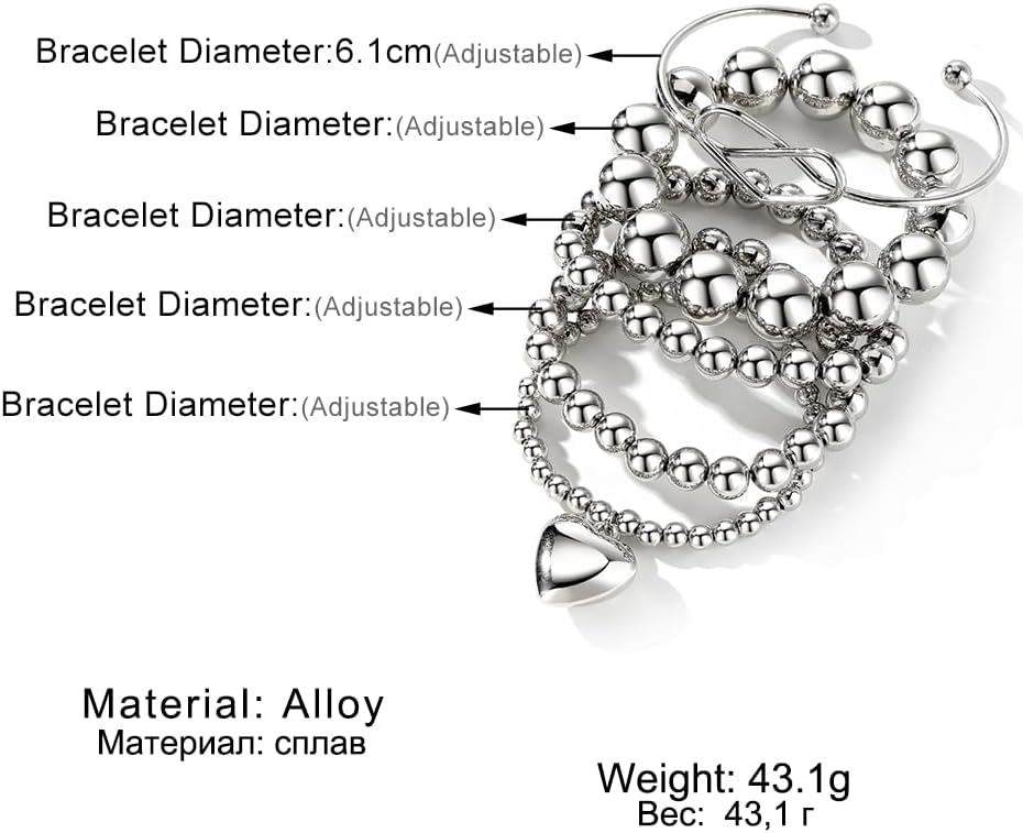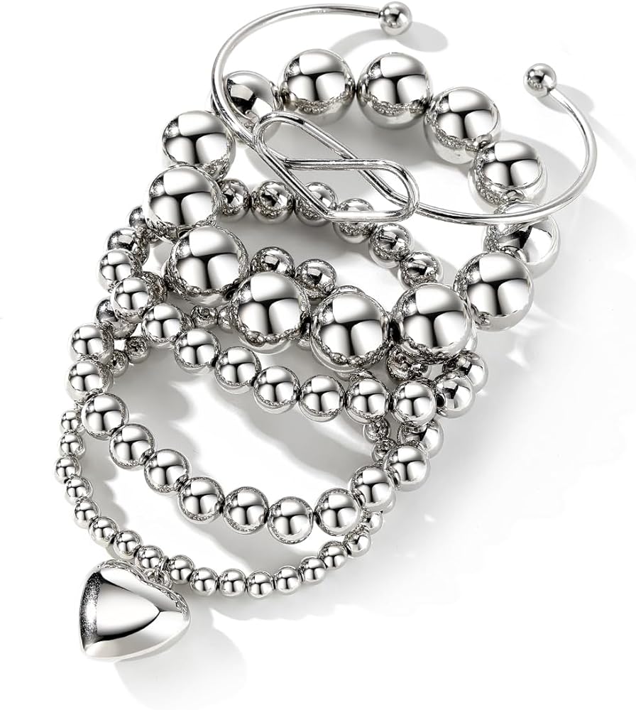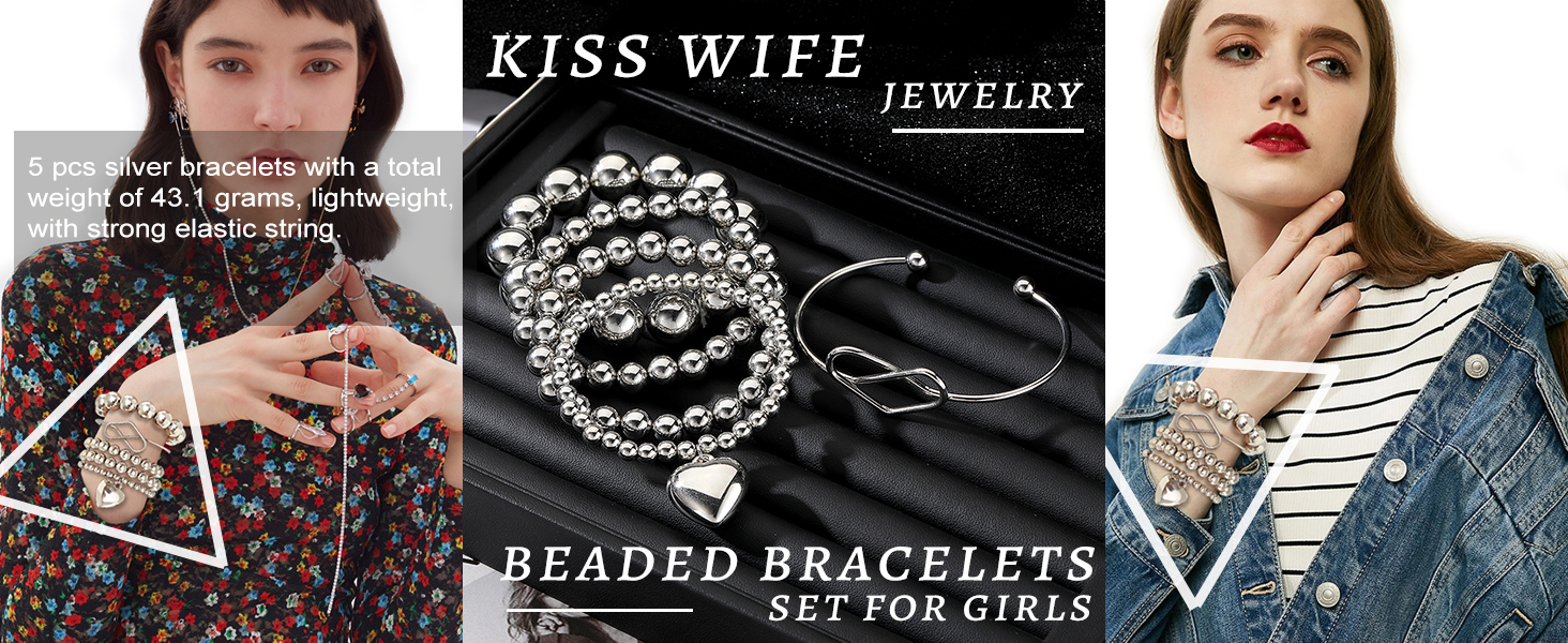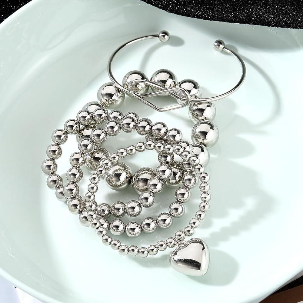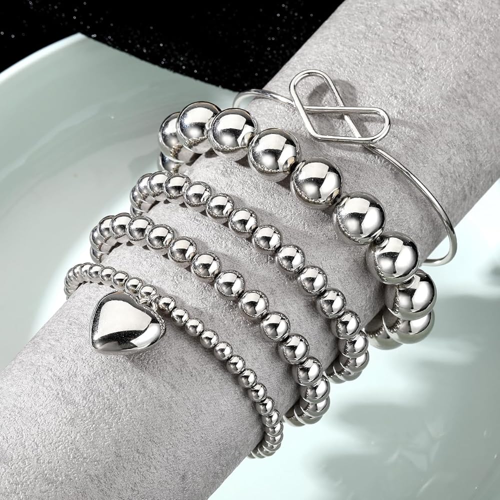 KISS WIFE مجموعة 5 قطع من الأساور الفضية المطرزة للنساء والفتيات، قابلة للتكديس وقابلة للتمدد على شكل قلب مرن وخرز على شكل كرة سلسلة سوار خفيف الوزن وحفلات أعياد الميلاد وعيد الميلاد للنساء هدية مجوهرات عصرية لها