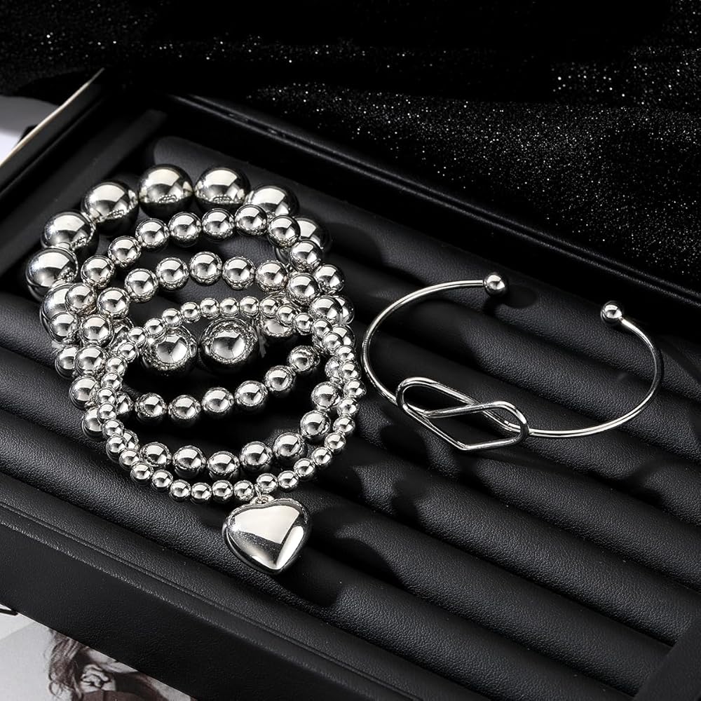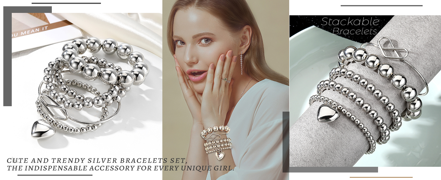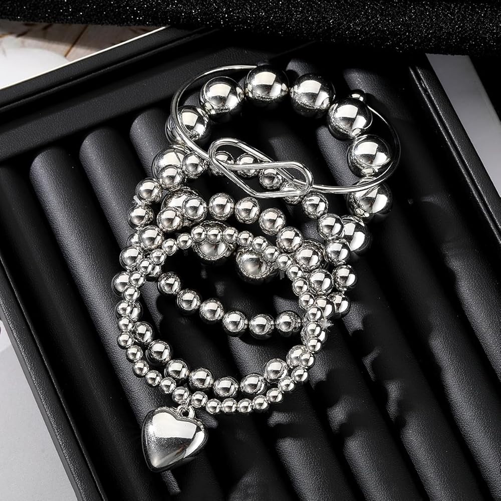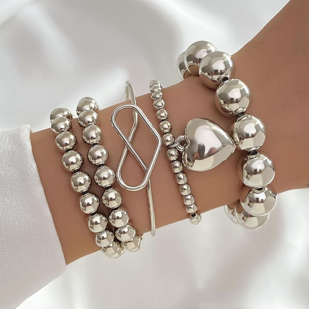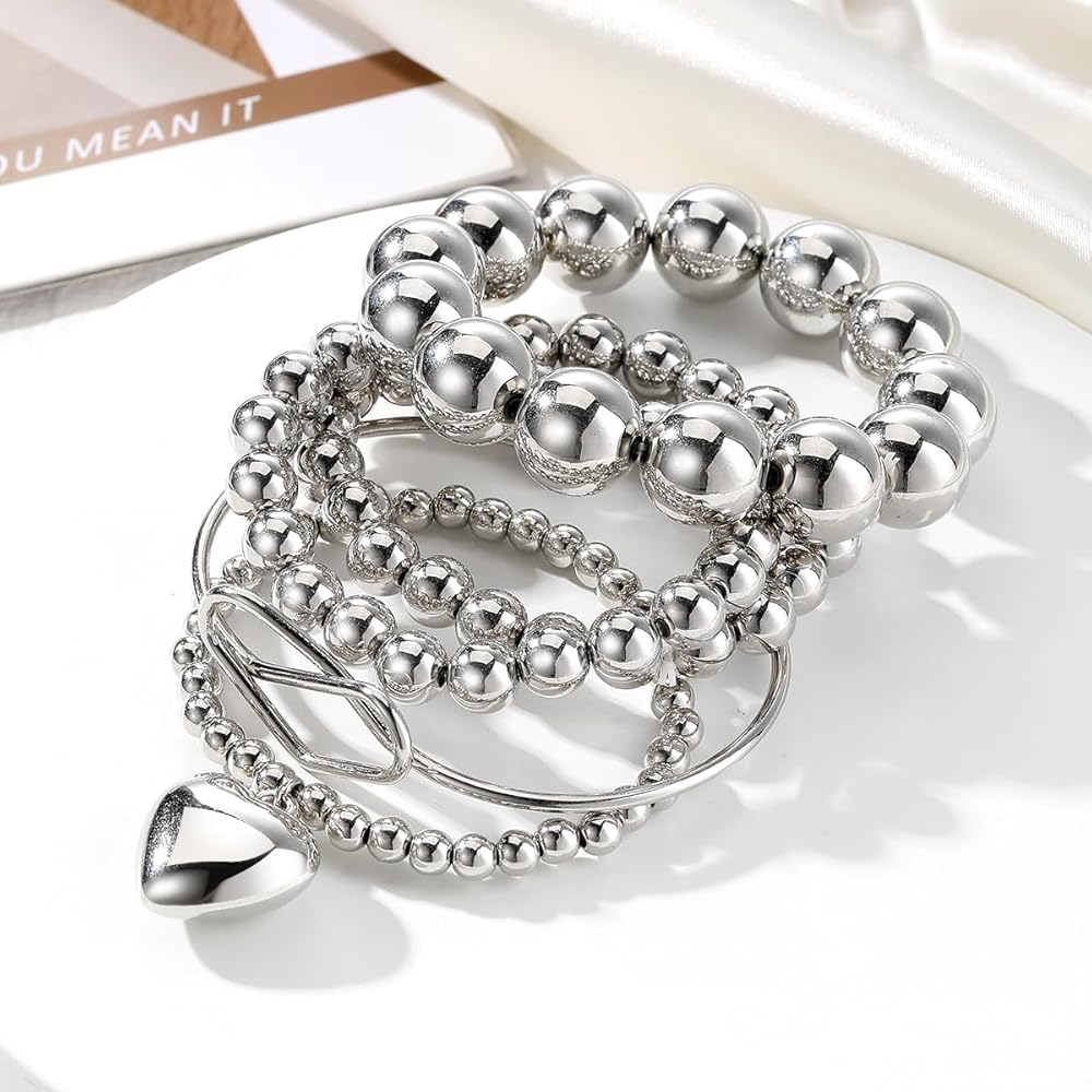 KISS WIFE مجموعة 5 قطع من الأساور الفضية المطرزة للنساء والفتيات، قابلة للتكديس وقابلة للتمدد على شكل قلب مرن وخرز على شكل كرة سلسلة سوار خفيف الوزن وحفلات أعياد الميلاد وعيد الميلاد للنساء هدية مجوهرات عصرية لها