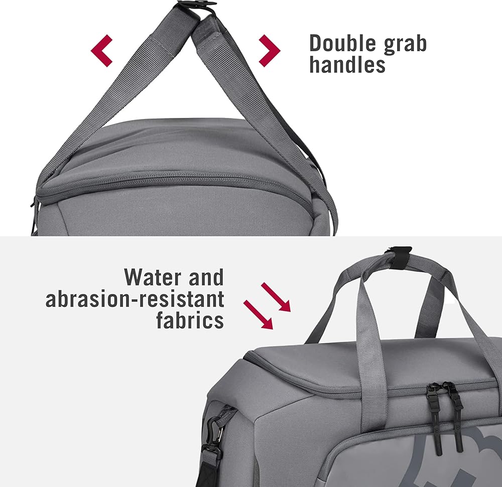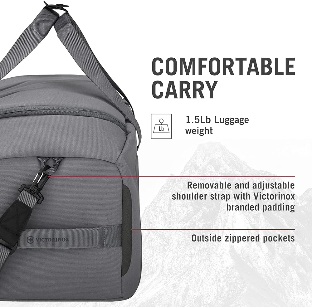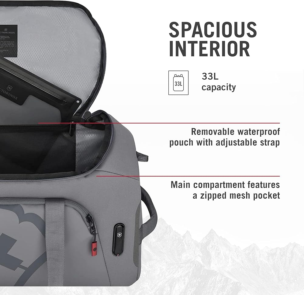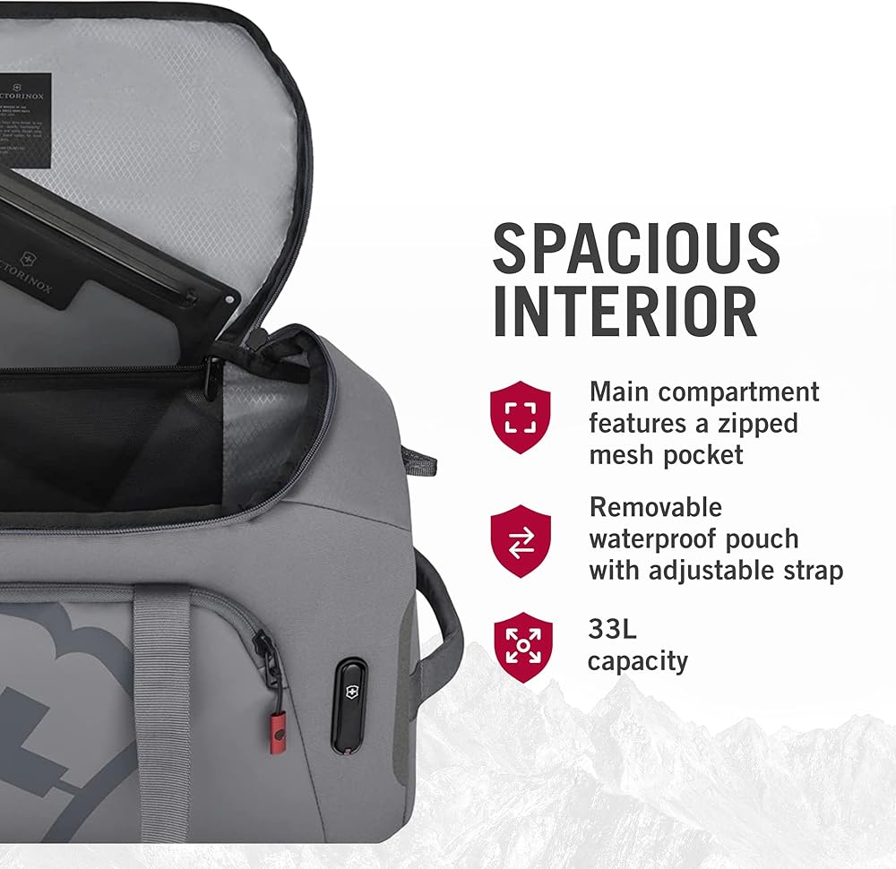 Home Products Travel Gear Duffel Bags and Totes Touring 2.0 Sports Duffel Removable waterproof pouch with adjustable strap Removable and adjustable shoulder strap with Victorinox branded padding Main compartment features a zipped mesh pocket Option for personalization; choose from initial engraving or customize with a personal message Item number 612126 Size 11.4 x 19.7 x 11 in Capacity 33 l Weight 1.5 lb Collection Touring 2.0 Height 11 in Length 11.4 in Width 19.7 in Weight 1.5 lb Material Polyester Capacity 33 l Color Black