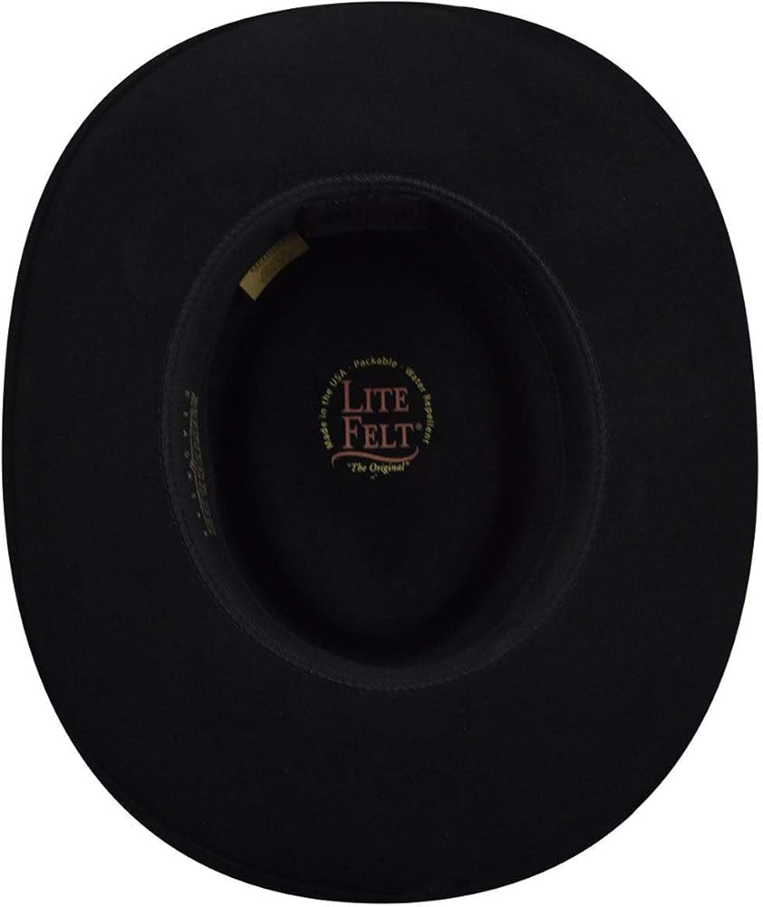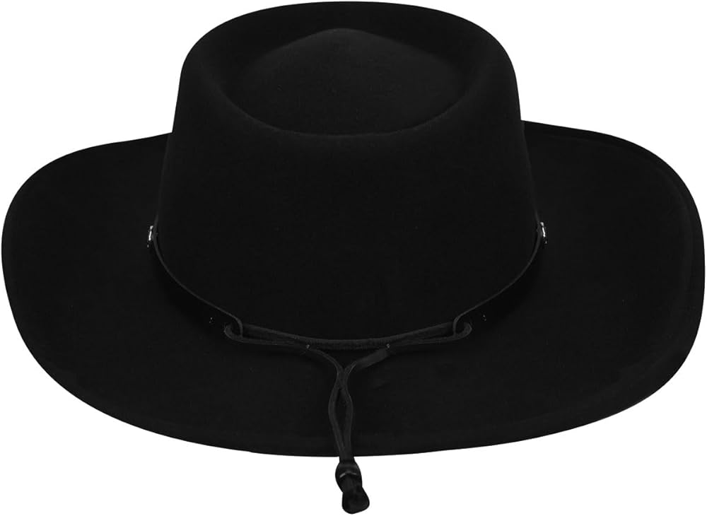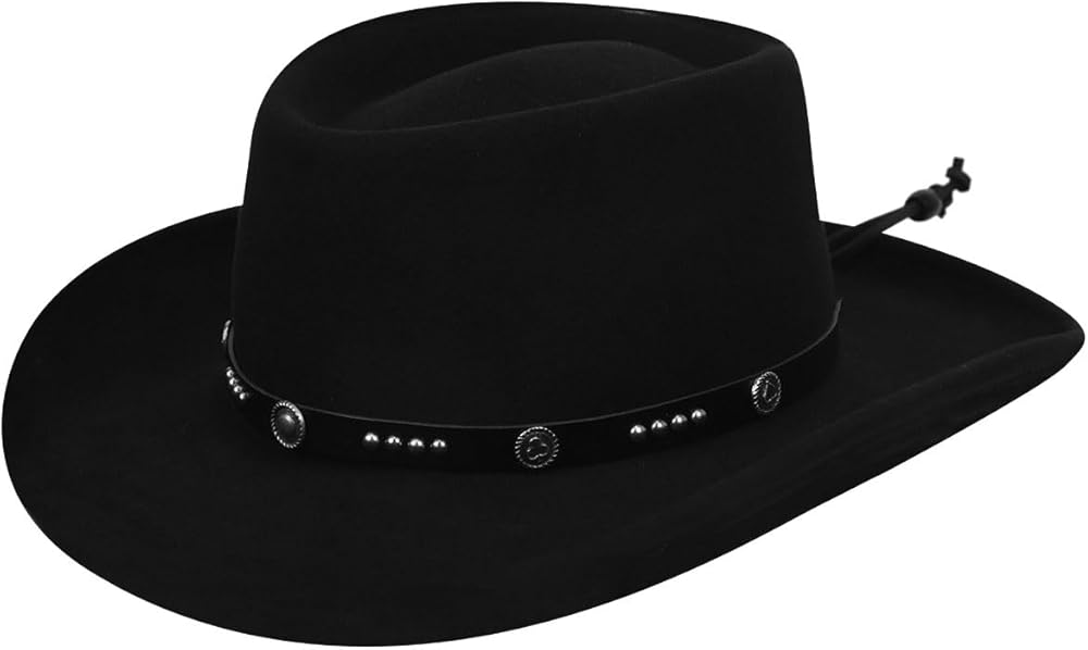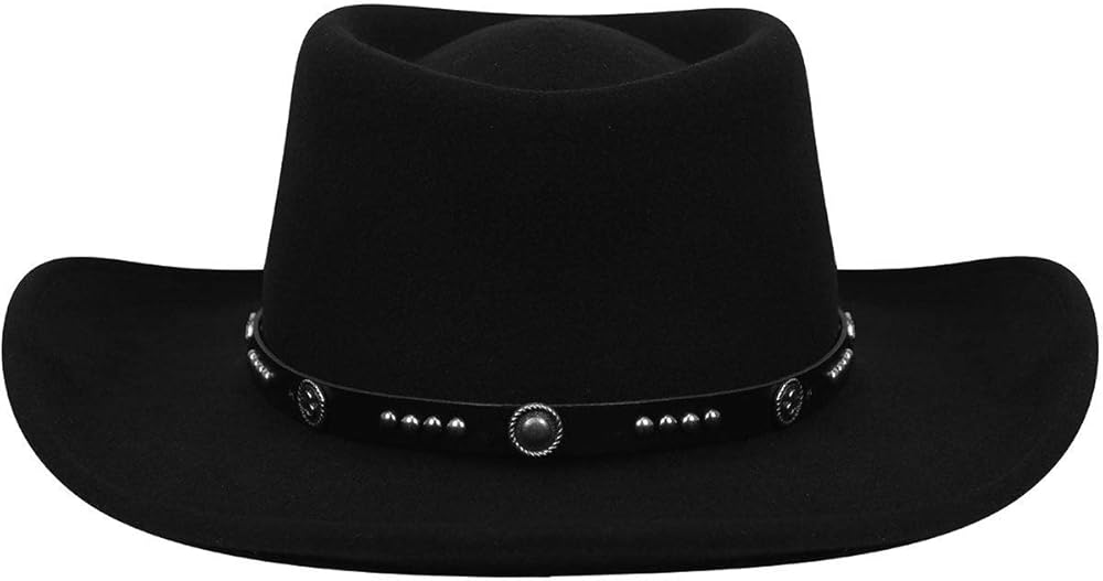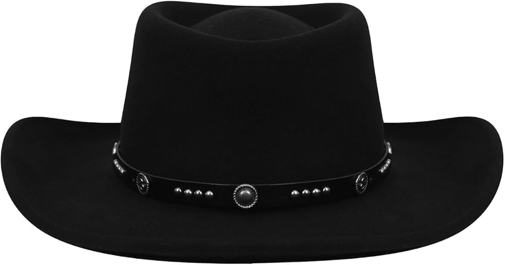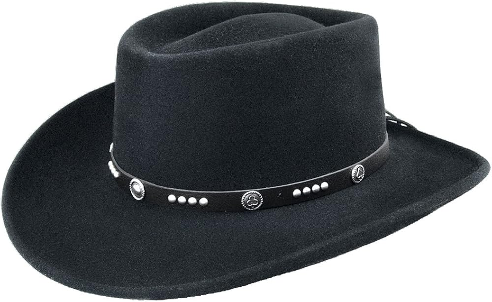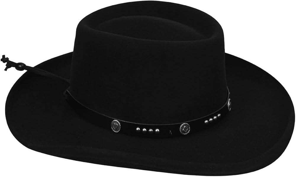 Joker is a black Litefelt® telescope crown hat. It has a black leather band with studs and conchos sporting deck of cards symbols in the center.