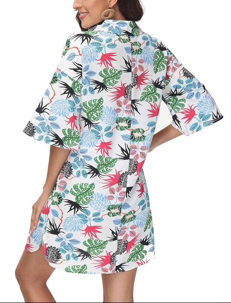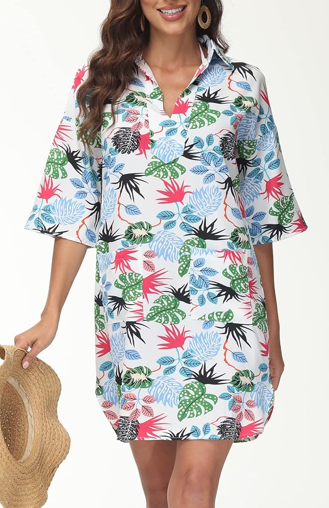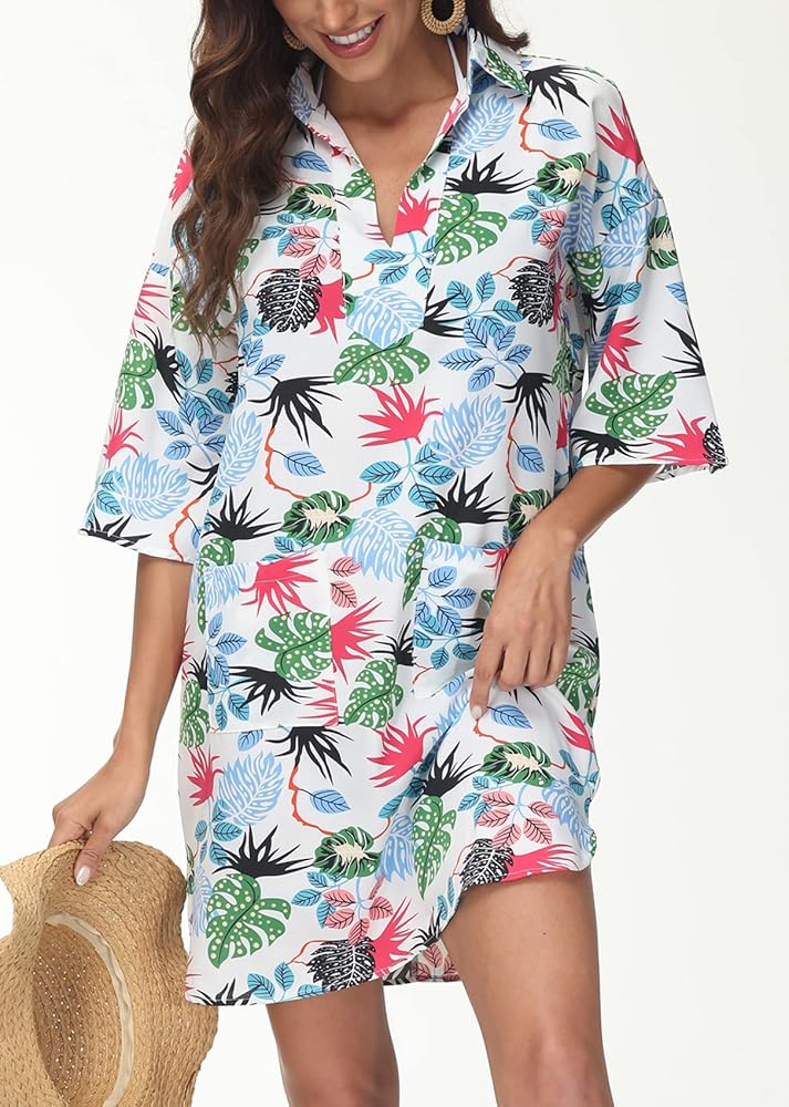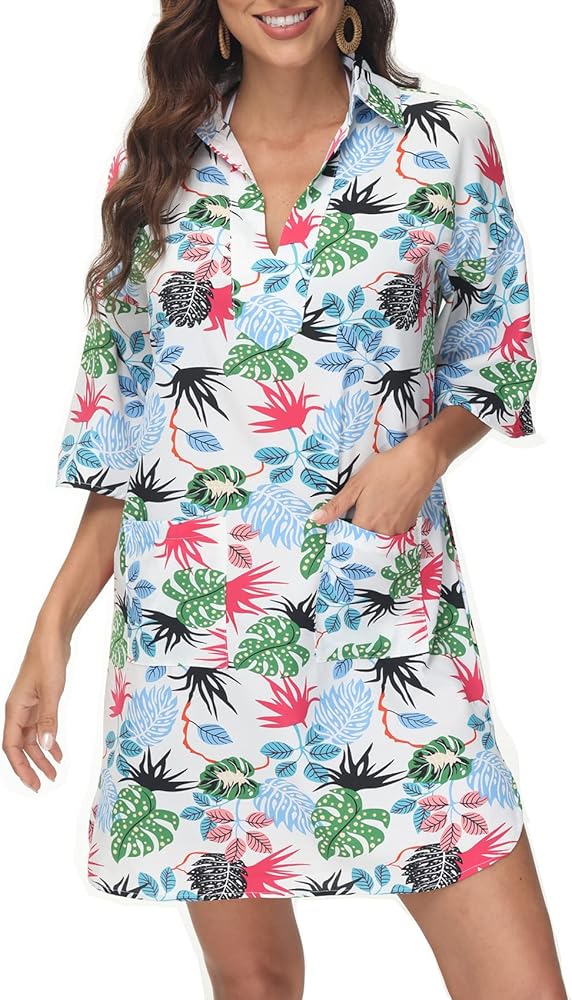 غطاء لباس السباحة للنساء مع جيوب، قميص سباحة مثير برقبة عميقة على شكل حرف V للرحلات البحرية، قميص هينلي بياقة، 3/4 كم واسع، طول فوق الركبة، حاشية منحنية. أغطية بدلة السباحة بوهو بأكمام قصيرة وجيوب، ملابس العطلات الاستوائية وفستان الشاطئ لقضاء عطلة هاواي.