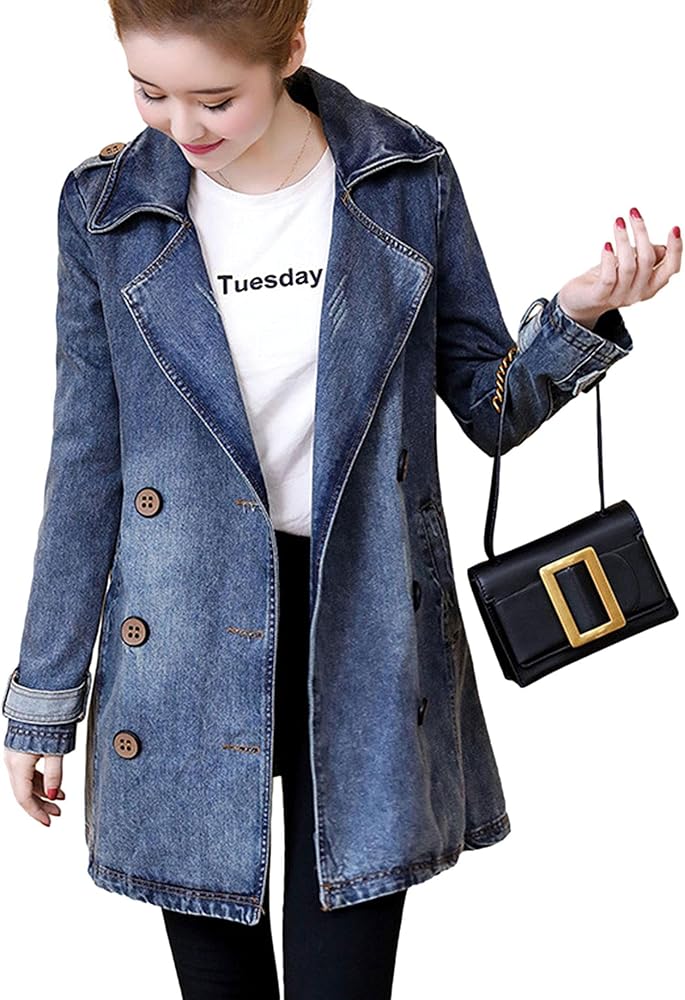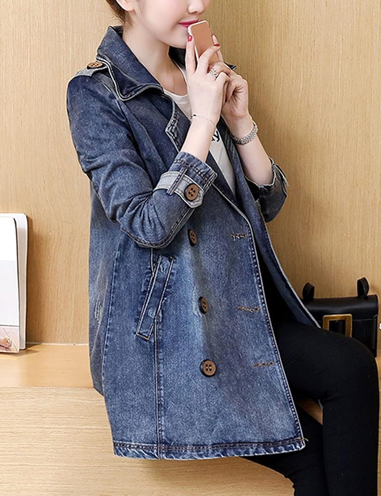 vintage notch lapel double breasted belted slim fit middle long length denim jean jacket trench coat for women girl outerwear
