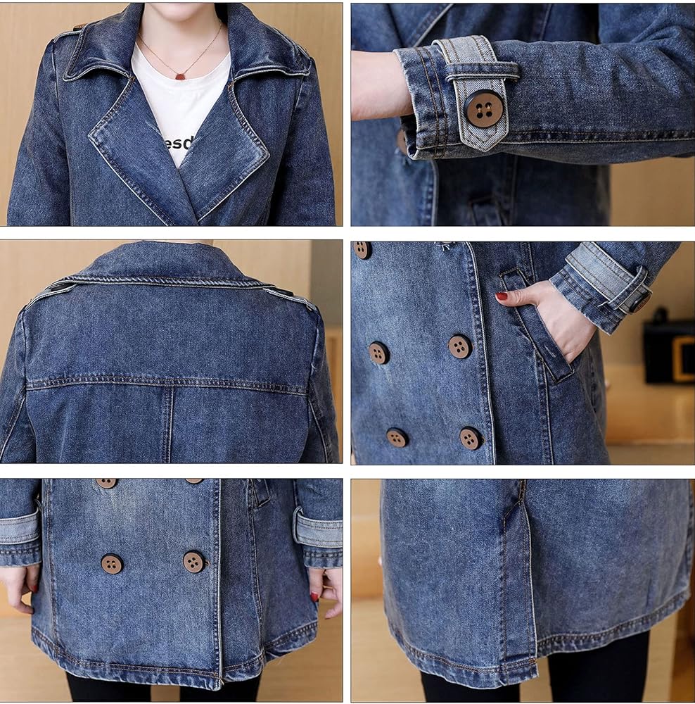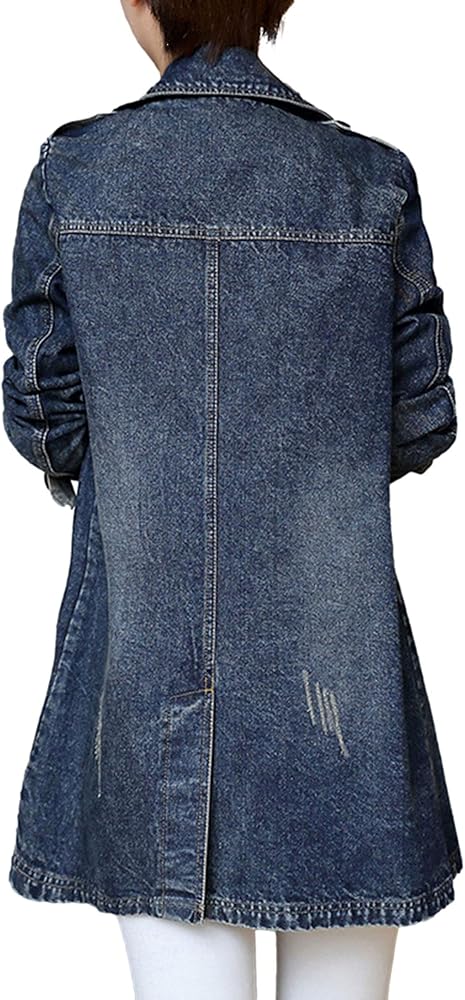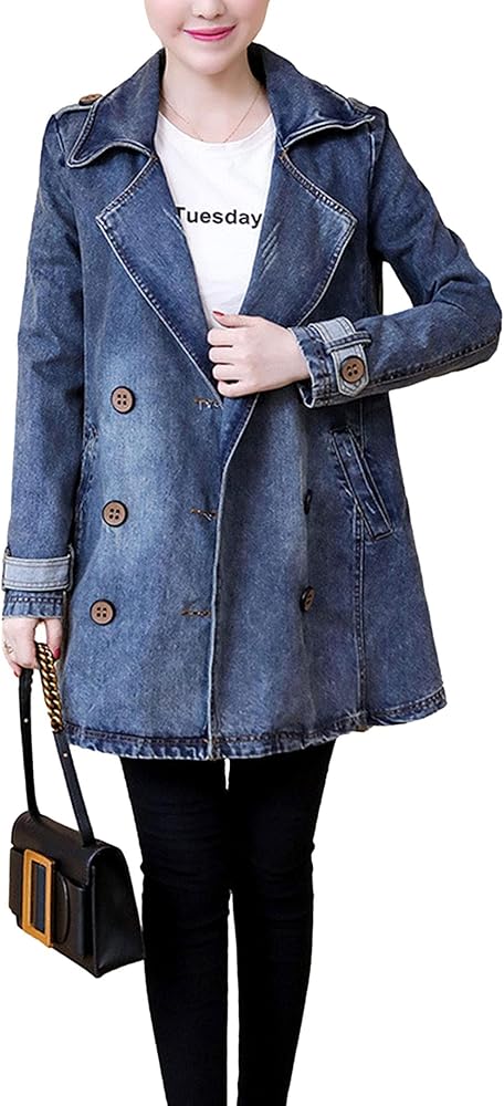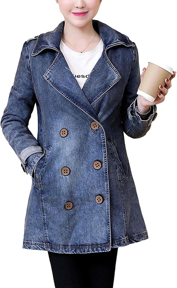 معطف نسائي عتيق لطيف مزدوج الصدر بياقة مدببة طويلة من قماش الدنيم