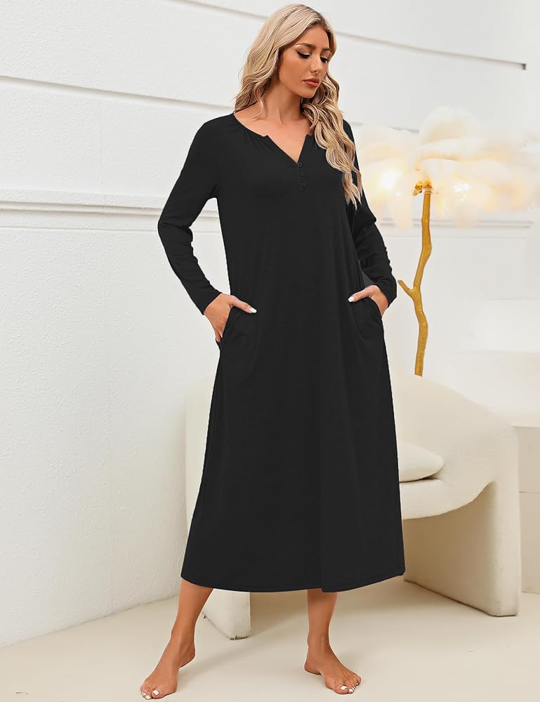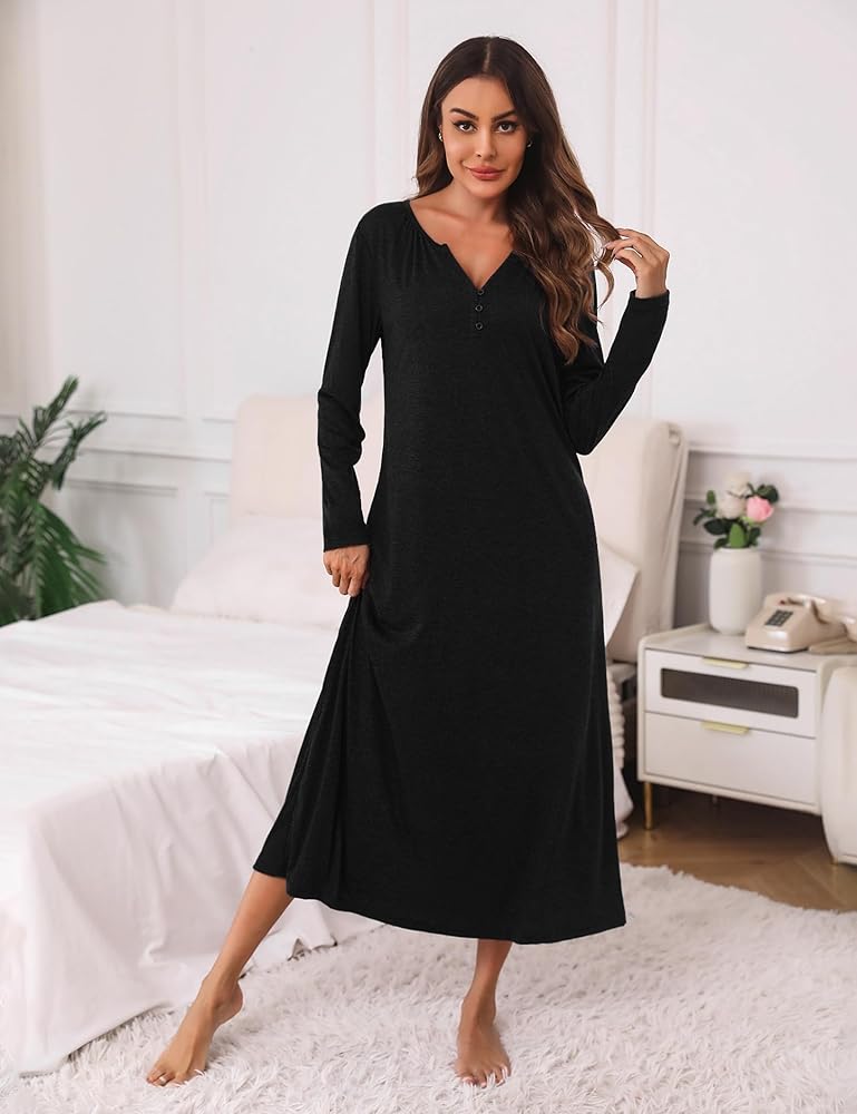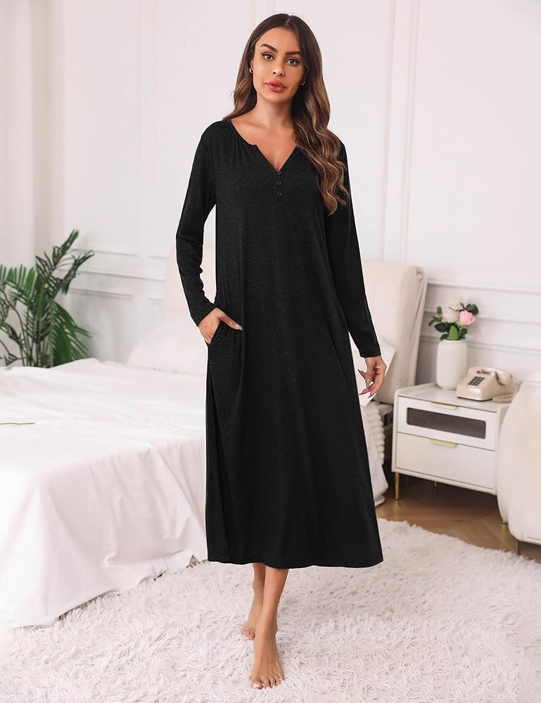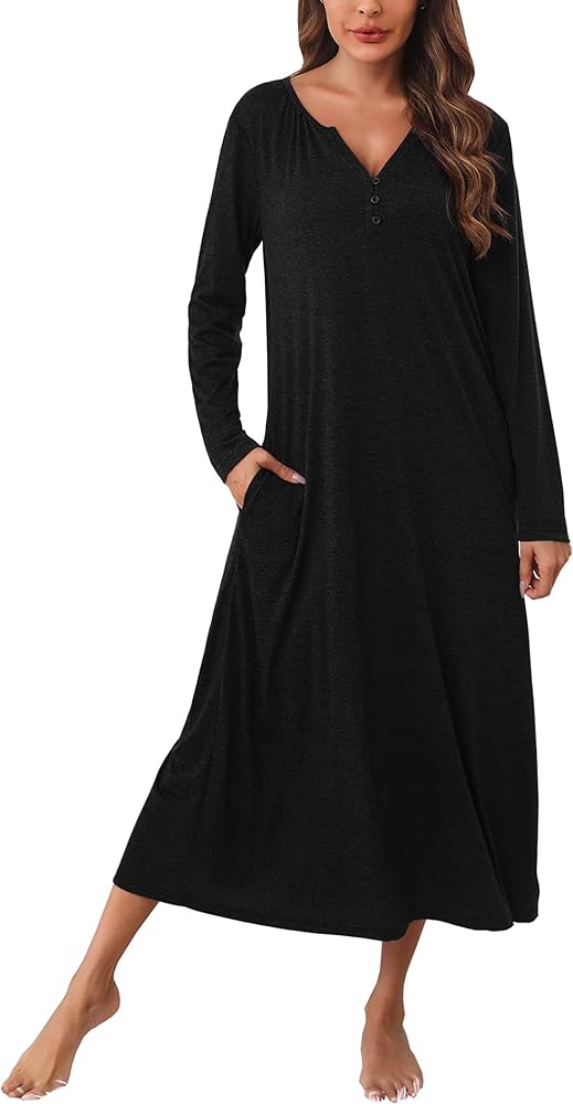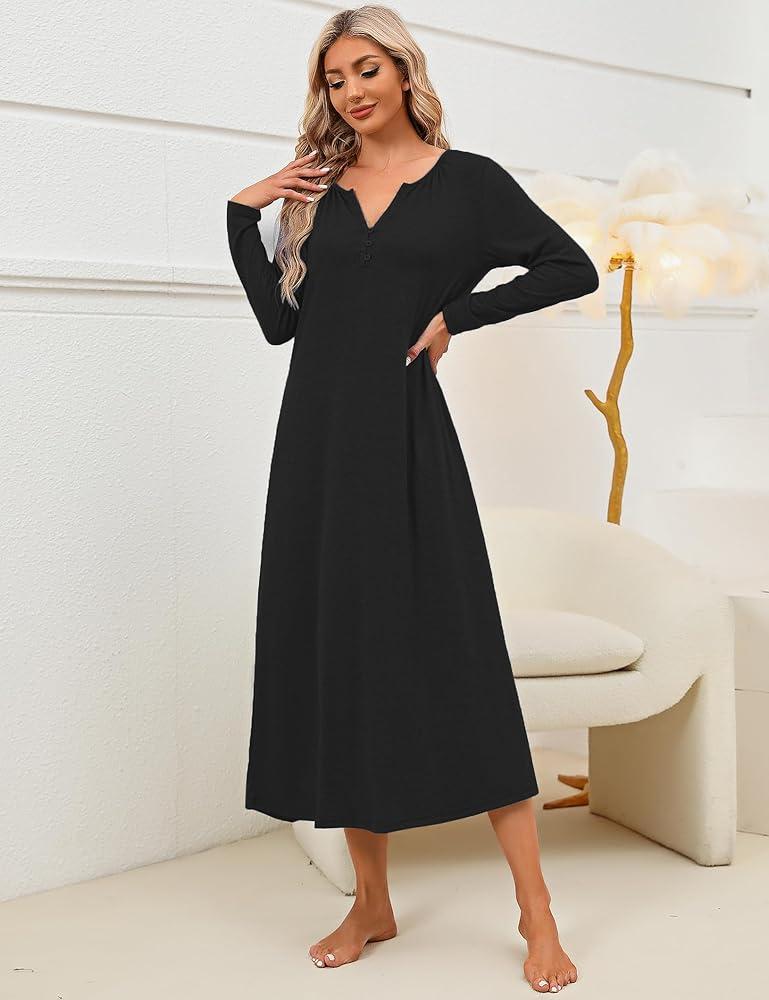 ثوب نوم كلاسيكي وأنيق: يتميز ثوب النوم طويل الأكمام برقبة هينلي كلاسيكية وتصميم زر عملي وطيات أمامية. مثالي كفستان للاسترخاء، أو ثوب نوم، أو ثوب نوم للرضاعة، أو رداء غبار لإعادة التأهيل، أو ملابس كاجوال.