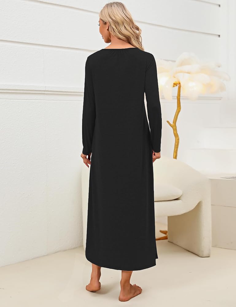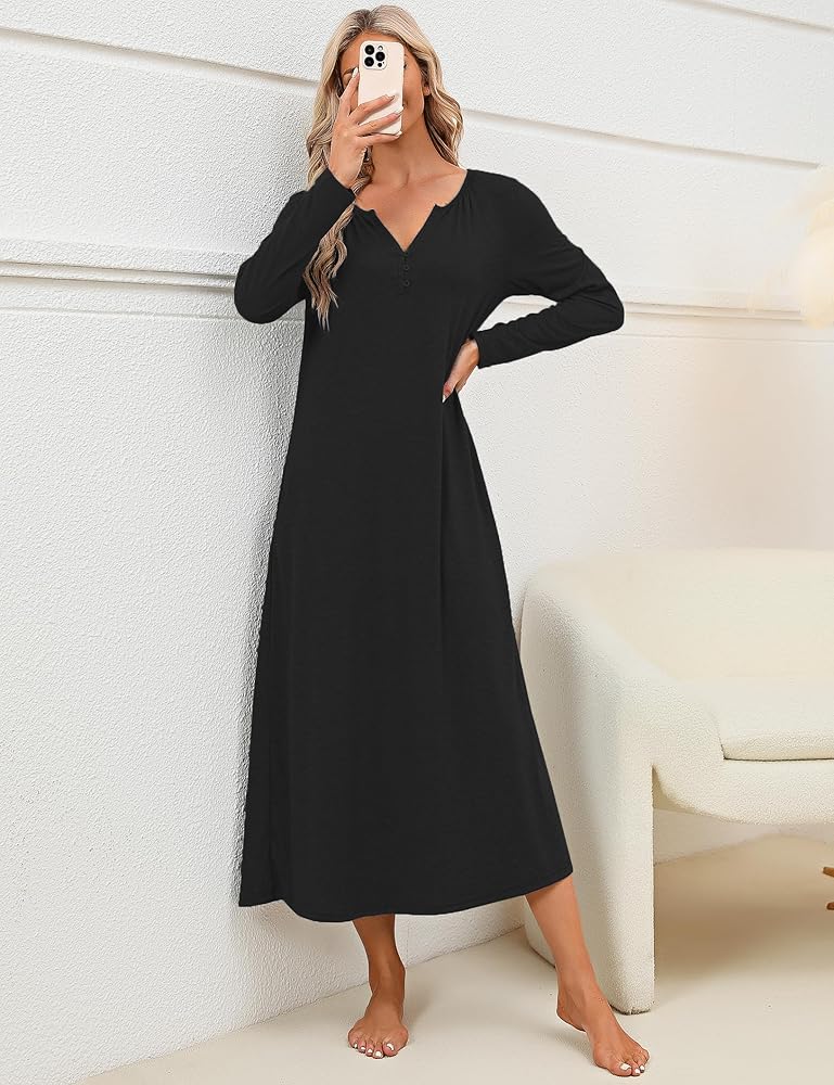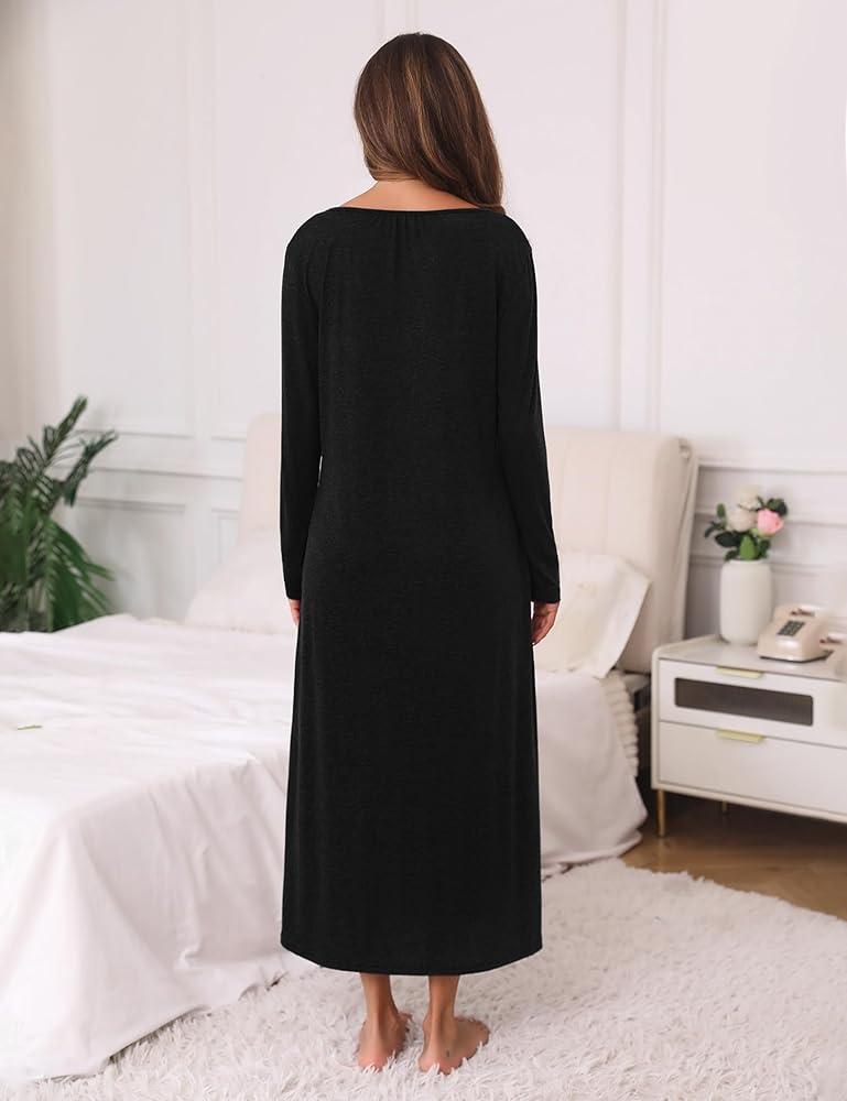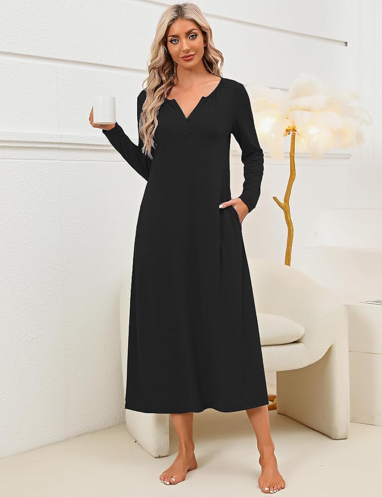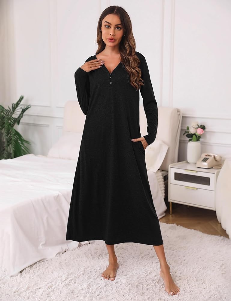 ثوب نوم كلاسيكي وأنيق: يتميز ثوب النوم طويل الأكمام برقبة هينلي كلاسيكية وتصميم زر عملي وطيات أمامية. مثالي كفستان للاسترخاء، أو ثوب نوم، أو ثوب نوم للرضاعة، أو رداء غبار لإعادة التأهيل، أو ملابس كاجوال.