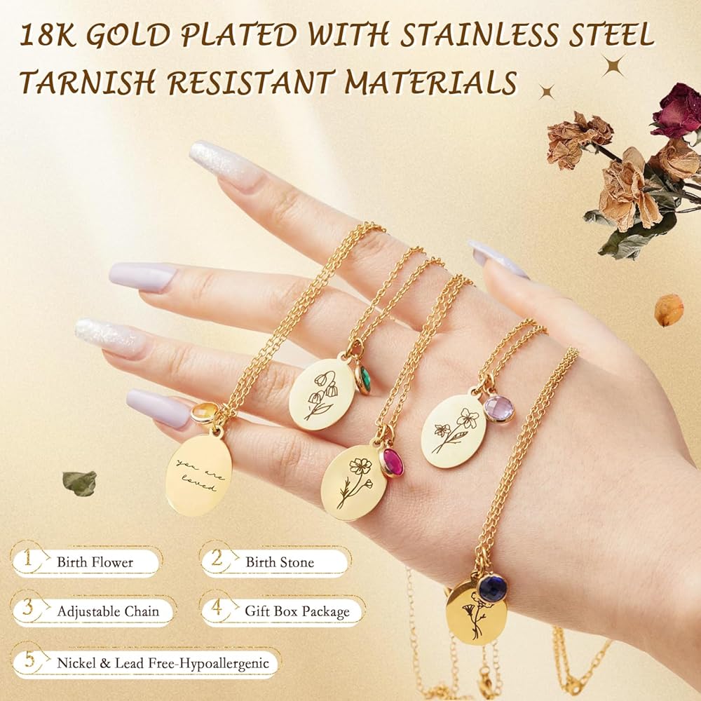 【قوية ومتينة】مصنوعة من الفولاذ المقاوم للصدأ المطلي بالذهب عيار 18 قيراط، وتوفر قلادة زهرة حجر الميلاد هذه متانة فائقة مقارنة بمواد النحاس أو السبائك. مادة الفولاذ المقاوم للصدأ مقاومة للصدأ والتشوه. مع قطر القرص البيضاوي 0.7 بوصة (جذاب ومناسب لمعظم الأشخاص) وطول سلسلة قابل للتعديل يبلغ حوالي 15 بوصة - 18 بوصة.