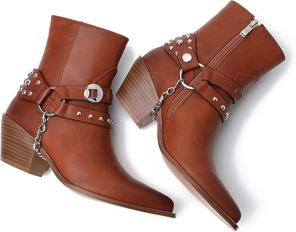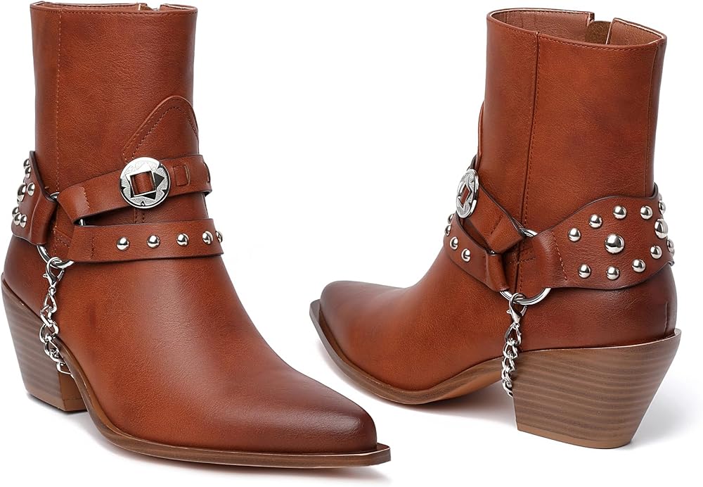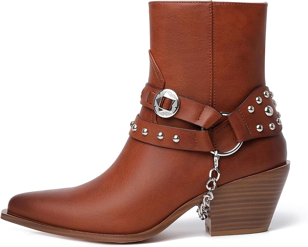 👢مصمم بأناقة: حذاء كاحل رعاة البقر بنمط راكبي الدراجات النارية. تتميز هذه الأحذية ذات الكعب السميك بحزام سلسلة قابل للإزالة وإبزيم سلسلة لتعزيز الموضة.