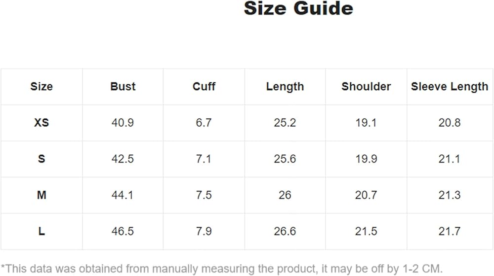 Large: Bust: 46.5", Cuff: 7.9", Length: 26.6", Shoulder: 21.5", Sleeve Length: 21.7"