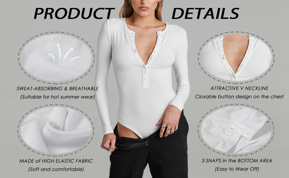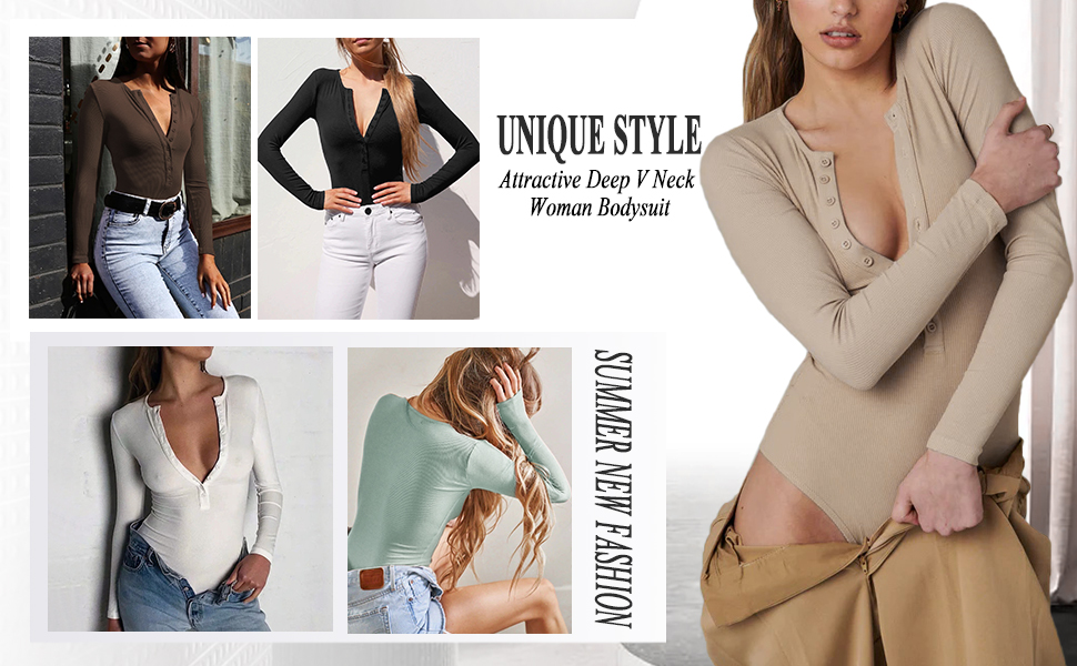 • Sexy Deep Scoop Neck--Deep V neck is the most feminine design and the button up detail at bust make it more fashion and unique. Perfect to match with shorts, jeans, pants, skirt, sweatpants, pants, dress, coats, cardigan, jackets or any other outfits. Wearing this Bodysuits Tops will show off your Unique temperament.