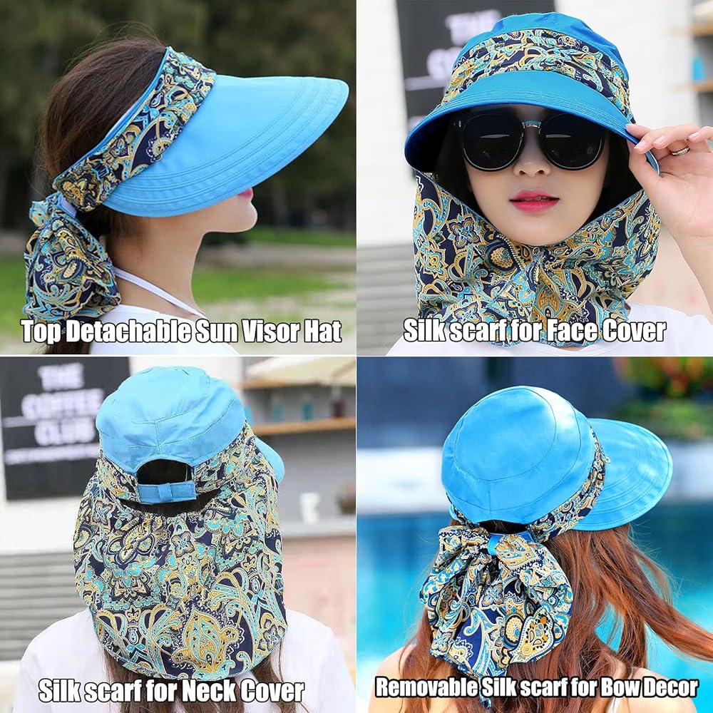 【قبعة شاطئ متعددة الأنماط】القبعة النسائية ذات الظل الشمسي للسيدات عملية وأنيقة، مع وشاح مطبوع بوهيمي متعدد الاستخدامات لإضافة الأناقة والجاذبية، والتي يمكن أن تكون مزدوجة كقناع أو واقي للكتف لحماية وجهك وأذنيك ورقبتك. في جميع الاتجاهات، عند عدم الاستخدام، يمكن استخدامها كديكور، وربطها في قوس لتزيين الجزء الخلفي من القبعة. لديك المرونة اللازمة لتشكيل النمط الذي تريده حسب الحاجة.