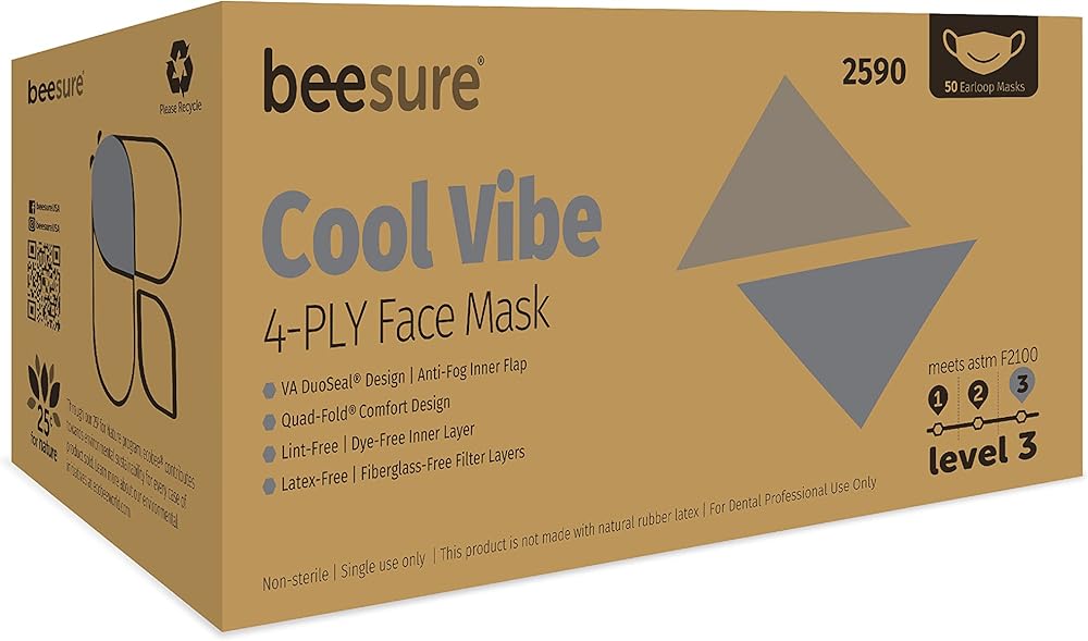 Bee Sure Vibe 4-PLY Face Masks are 100% latex-free and fiberglass free. Our VA Duo Seal with top and bottom metal strips provide a secure fit and unparalleled protection. A standard anti-fog flap provides clearer visibility against eyewear fogging. Bee Sure Vibe Face Masks also feature a Quad-Fold design that offers 15% more breathing volume for easy breathability without moisture build-up.