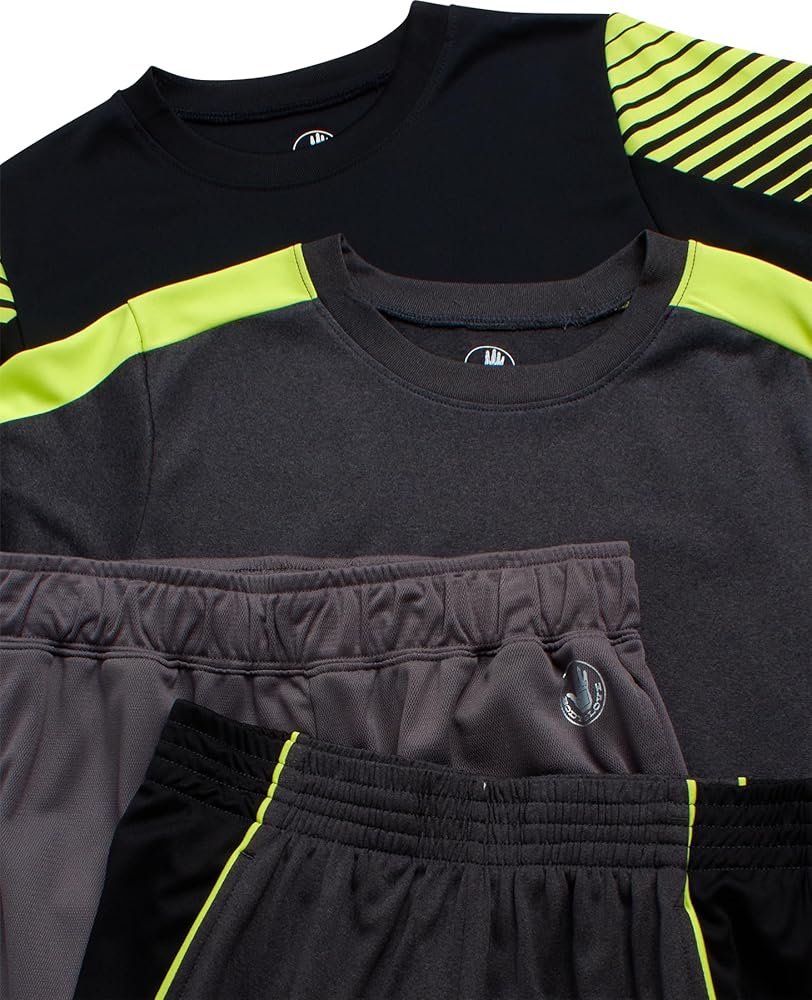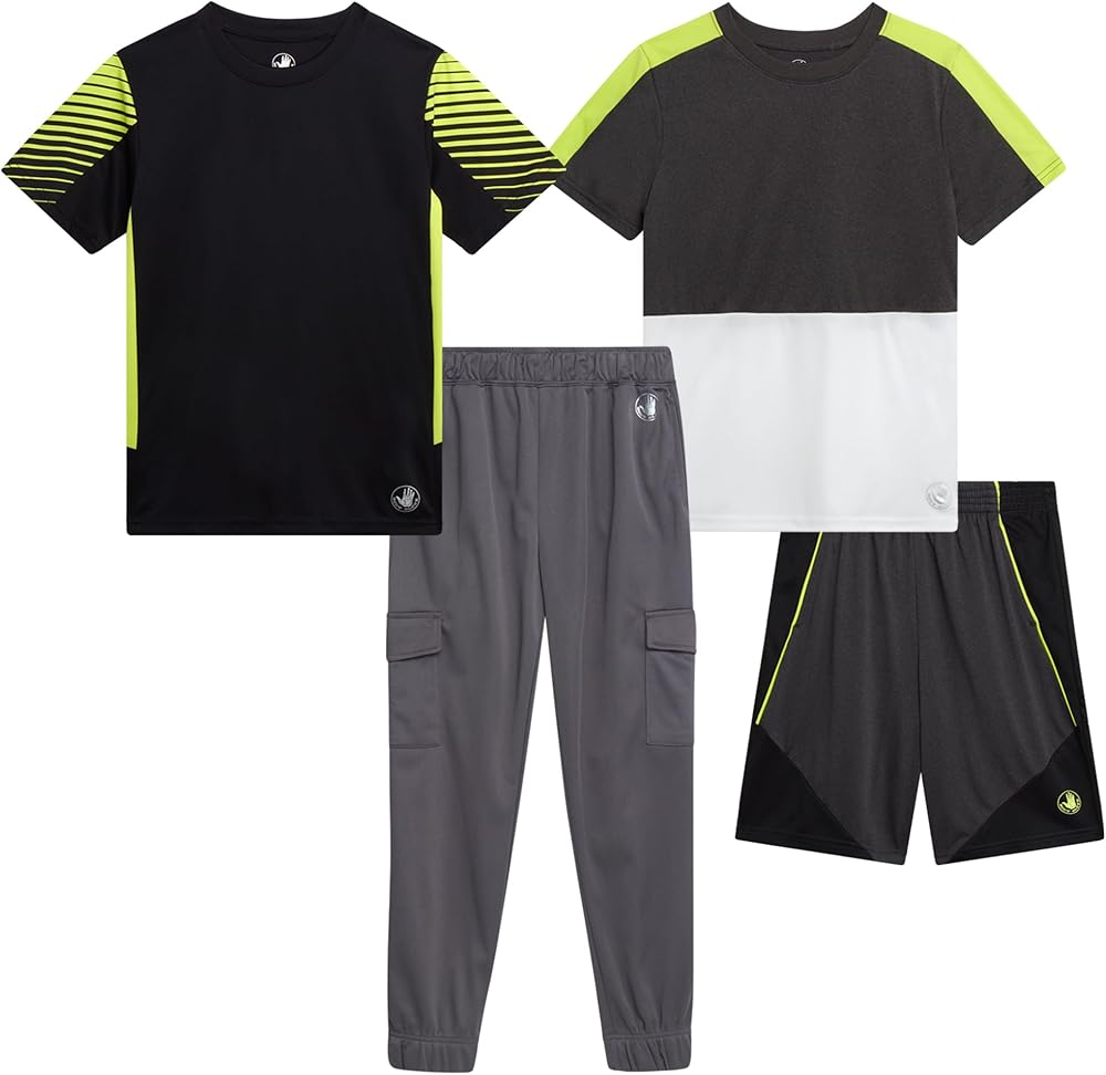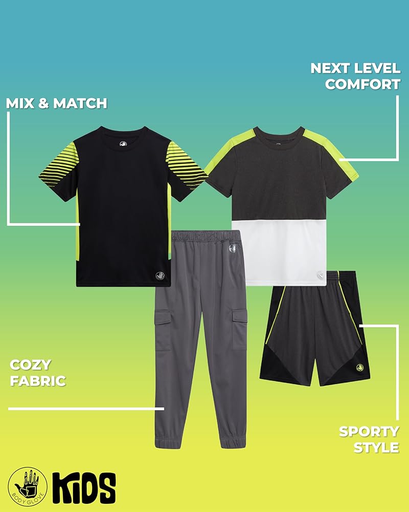 • PERFORMANCE-READY ATHLEISURE SET: Gear up your young athlete with the Body Glove Boys' 4 Piece Activewear Set – a dynamic ensemble designed for both style and performance; Featuring two short-sleeve T-shirts, gym shorts, and fleece jogger sweatpants, this set ensures he's ready for any active pursuit; Elevate his athletic wardrobe with this performance-packed ensemble that seamlessly blends comfort, style, and passion for a day filled with energy and play