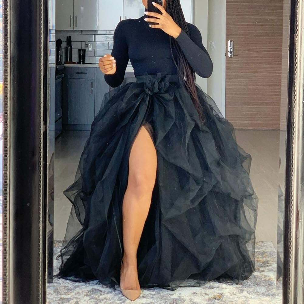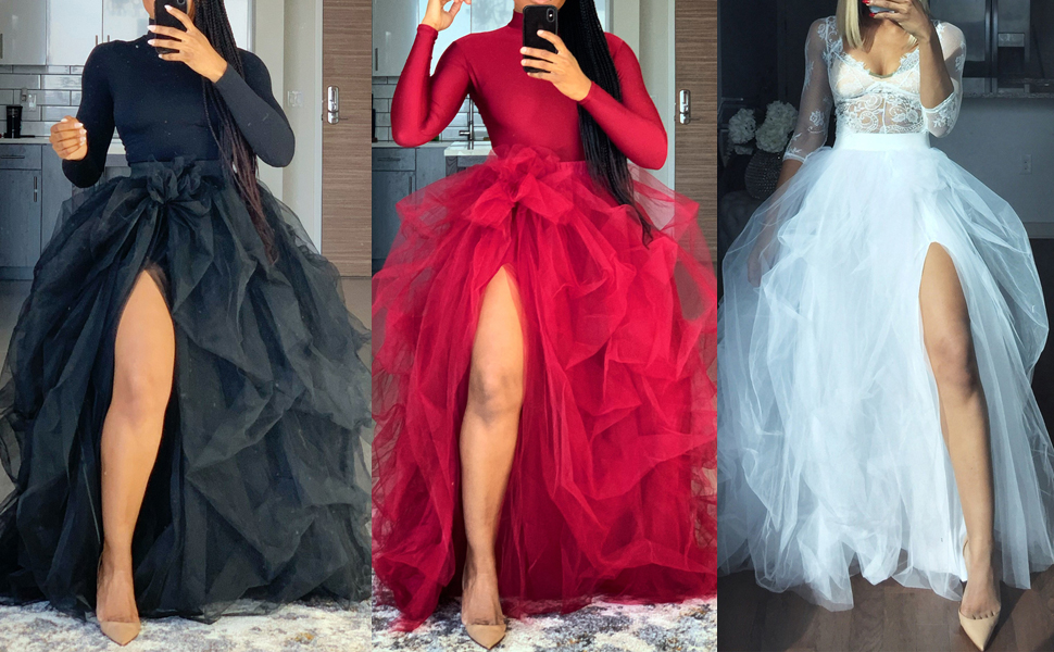 المزايا: فتحة أمامية لمظهر نحيف، طراز على شكل حرف A، خصر عالٍ، تنورة طويلة شبكية متأرجحة عتيقة، حزام خصر مطاطي قابل للتعديل.