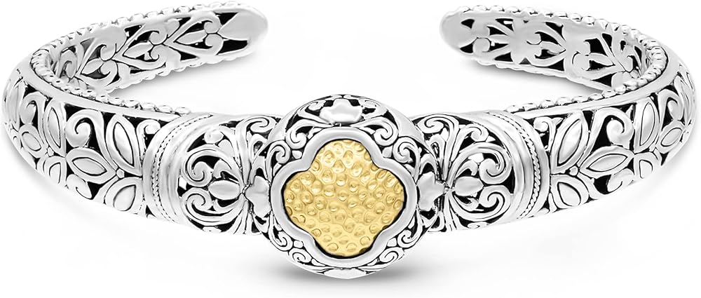 الفضة الإسترلينية 925 والذهب الصلب عيار 18 قيراط - مختوم بـ "925" و"18 قيراط". مصنوع يدويًا من الفضة الإسترلينية عيار 925 مع لمسة نهائية مؤكسدة تحمل توقيع بالي للحصول على مظهر فريد، ومزين بلمسات من الذهب الصلب عيار 18 قيراط (وليس طلاء الذهب). تعتبر مجوهرات الفضة الإسترلينية خيارًا رائعًا للأفراد ذوي البشرة الحساسة جدًا، على عكس المعادن الرخيصة، فإن الفضة الإسترلينية لا تهيج بشرتك وسوف تدوم مدى الحياة مع العناية الصحيحة.