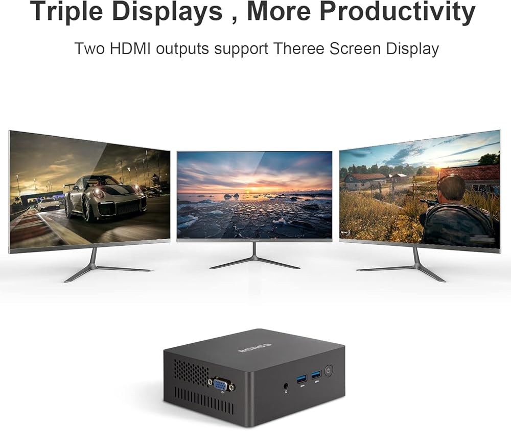 💻【شاشة عرض مزدوجة 4K ودعم لاسلكي】رسومات UHD مدمجة، يتميز سطح المكتب Mini PC من Benss بمنفذ HDMI مزدوج ومنفذ VGA، ويدعم ثلاث شاشات عرض فائقة الدقة 4K@60 هرتز (4096 × 2160) ويجلب رؤية مذهلة. لا تتردد في الاستمتاع بتصفح الويب بدقة 4K وتشغيل الفيديو ومشاهدة التلفزيون وبث الألعاب مع عائلتك. ثنائي النطاق 2.4 + 5.0 جيجا هرتز Wi-Fi BT5.0 مع مقاومة أقوى للإزعاج وإشارة لاسلكية أكثر استقرارًا.