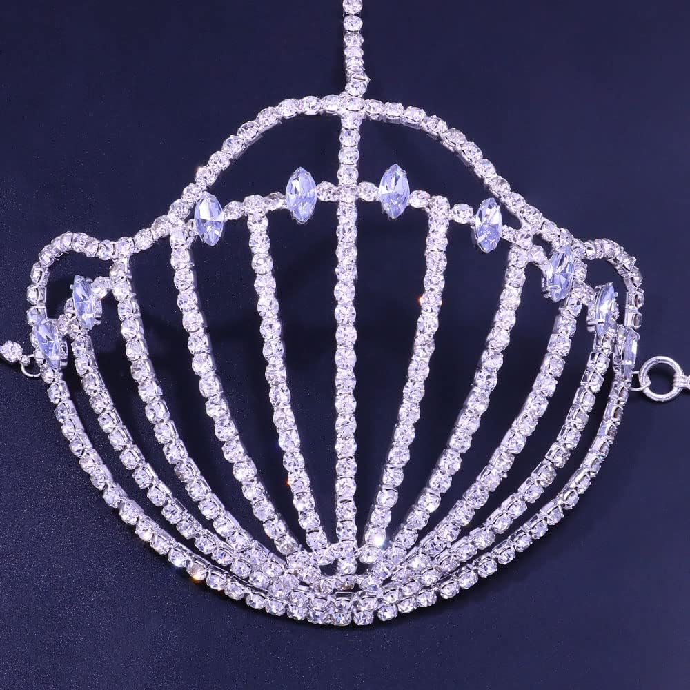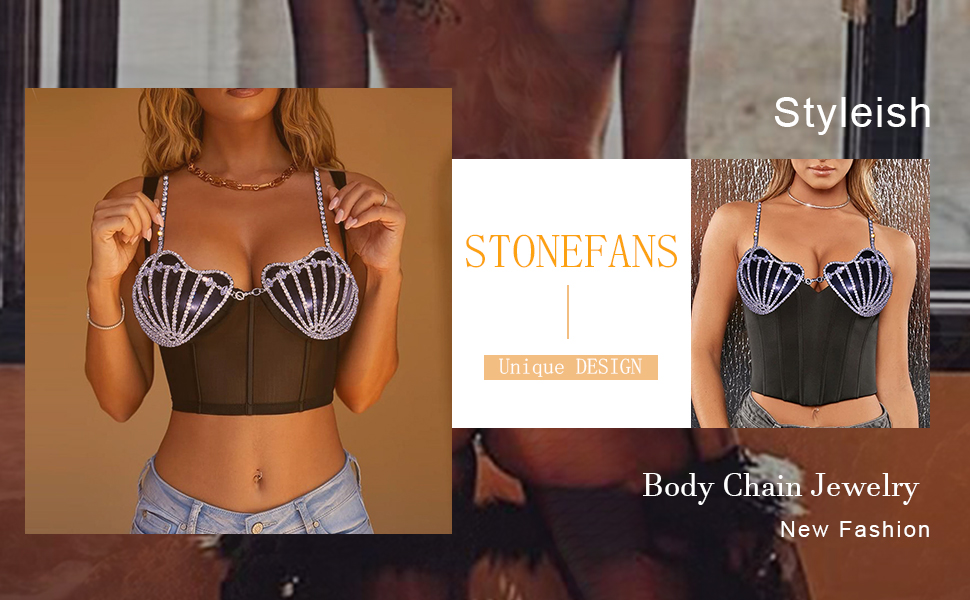 STONEFANS حجر الراين حورية البحر الصدرية سلاسل الجسم للنساء مثير الفضة بيكيني صدف الصدرية سلسلة تسخير ملهى ليلي الشاطئ الصدر سلسلة الجسم مجوهرات اكسسوارات