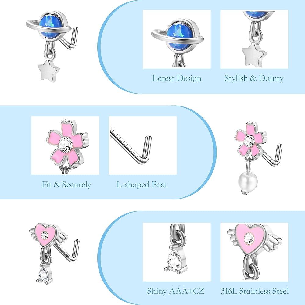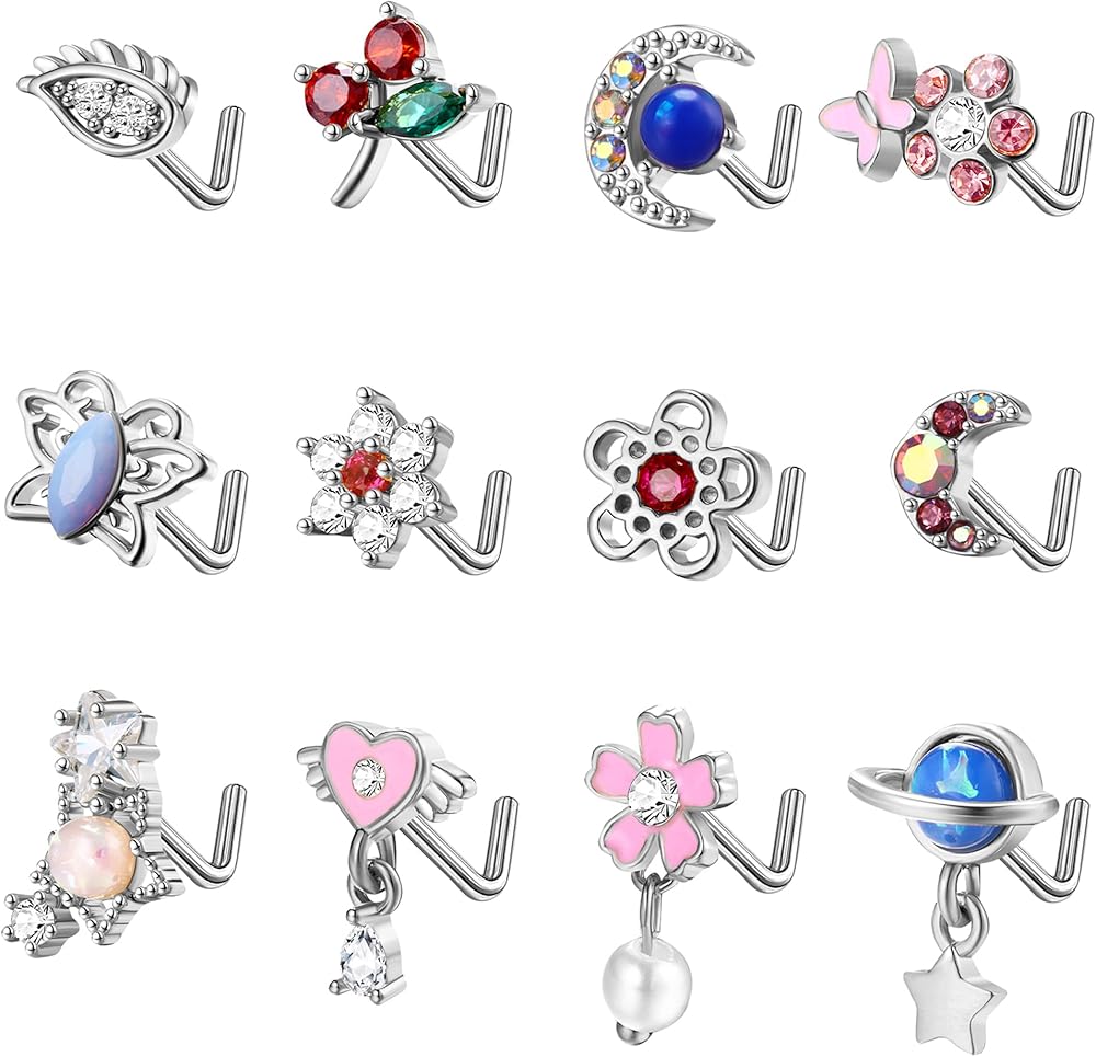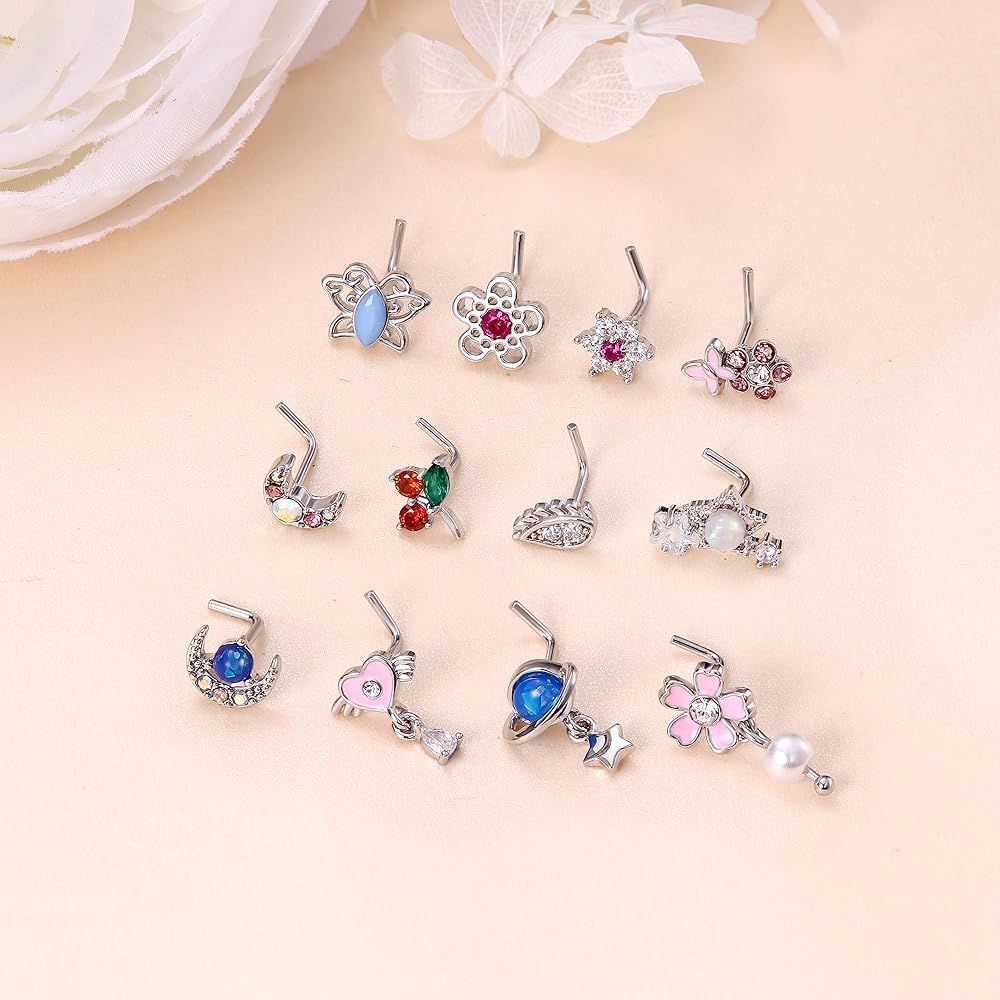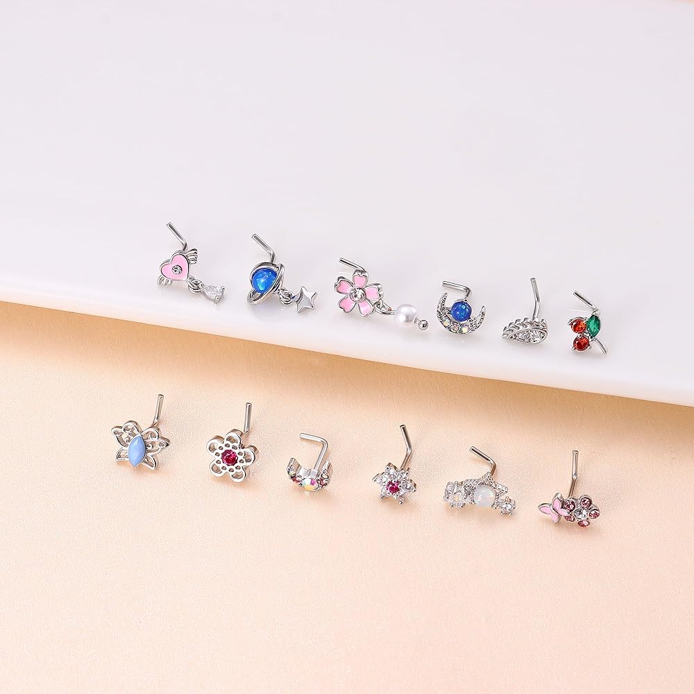مجموعة حلقات الأنف: توفر هذه العبوة 12 حلقة أنف ذات طراز فريد. من بين التصميمات المضمنة عناصر الفراشة الجميلة والزهرة والأوبال والنجمة، بالإضافة إلى أنماط أخرى من الموضة. تم تصميم كل حلقة أنف بأقصى قدر من العناية والاهتمام بالتفاصيل لضمان مظهرك وشعورك بأفضل حالاتك.