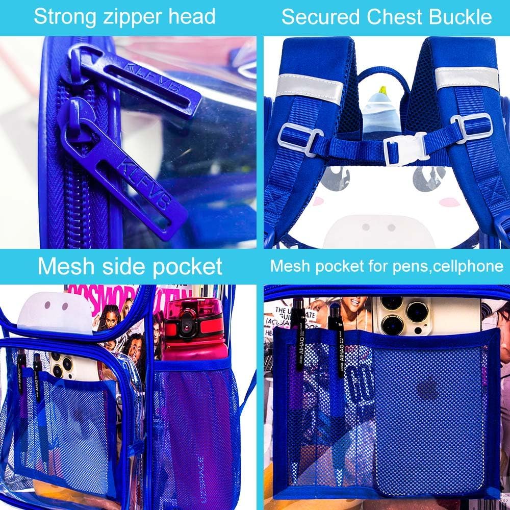 حقيبة ظهر شفافة ومريحة: أحزمة مبطنة (مع خطوط عاكسة وإبزيم على الصدر) تقلل الضغط على الأكتاف الصغيرة، والسحابات المزدوجة الدقيقة والجيوب الشبكية الجانبية تجعل حقيبة الظهر الشفافة هذه ممتعة في الاستخدام.