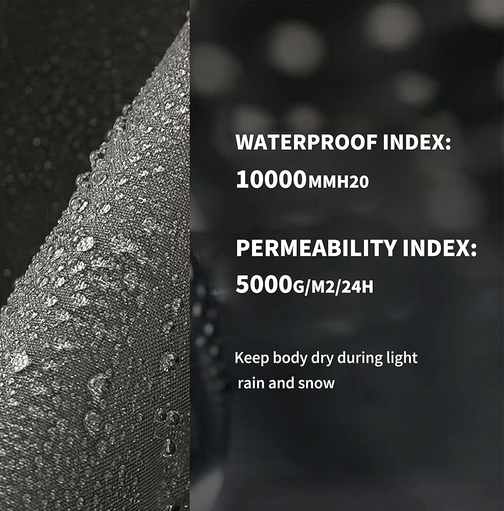 امتصاص الماء والرطوبة - مؤشر مقاومة الماء: 10000 مم ارتفاع 20، مؤشر النفاذية: 5000 جم/م2/24 ساعة. يوفر حماية مستمرة ويحافظ على جفاف الجسم أثناء المطر الخفيف والثلج.