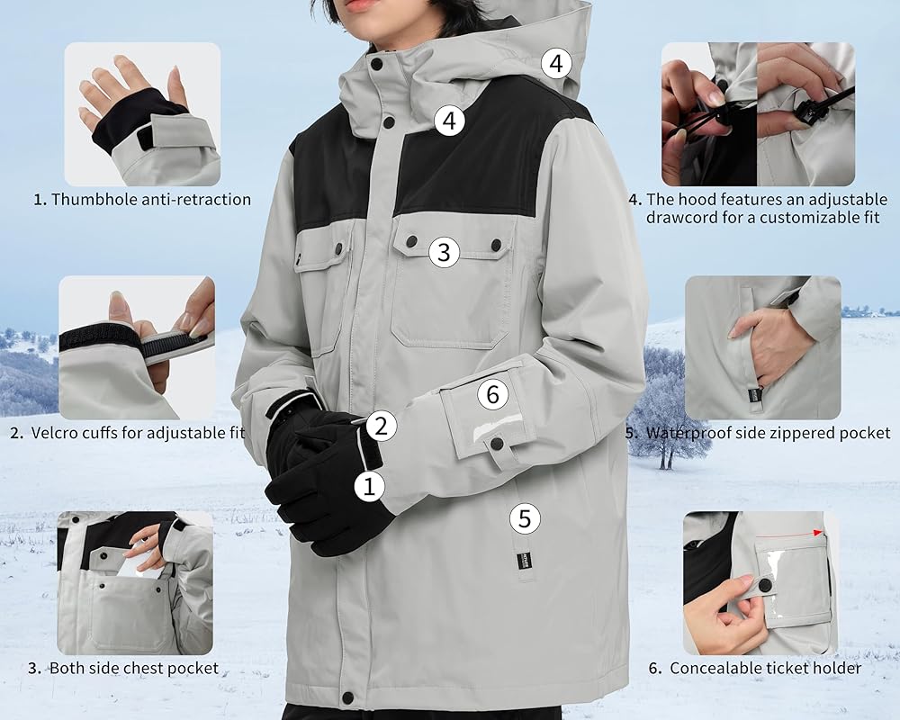 تصميم متعدد الوظائف - غطاء رأس ذو سعة كبيرة مع رباط حافة لتثبيته على خوذتك، سحاب YKK ثنائي الاتجاه متين وسلس، فتحة كابل سماعة الرأس مضادة للفقدان، أساور أكمام قابلة للتعديل مقاومة للرياح، جيوب مزدوجة بسحاب مقاومة للماء. جيب مخفي لتمرير الرفع، وجيب شبكي داخلي لنظارات التزلج، وحزام خصر مقاوم للماء قابل للإزالة يمكن أن يمنع الثلج من الدخول إلى البطانة في حالة السقوط.