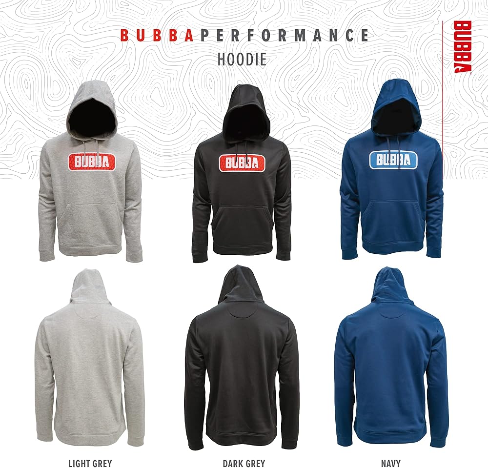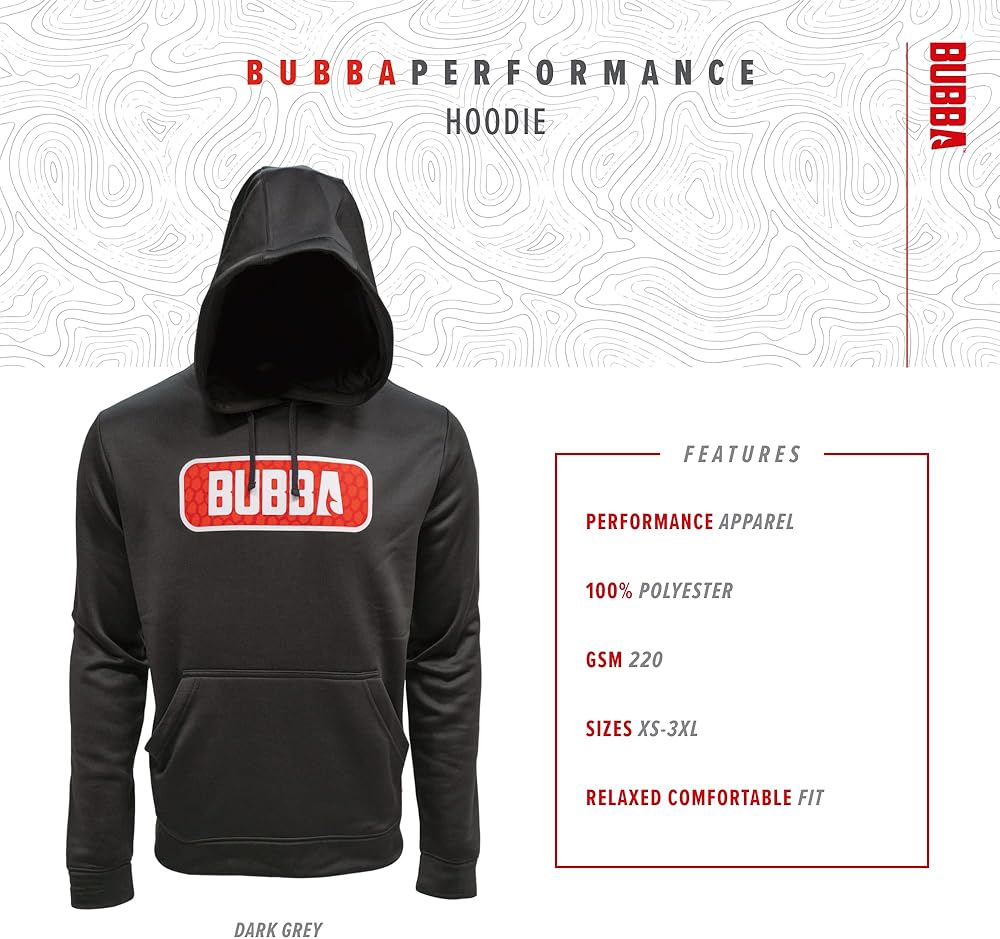 • SPECS: This dark grey Hoodie offers a quality, true to size fit for performance with a front pouch, drawstring hood, and BUBBA logo