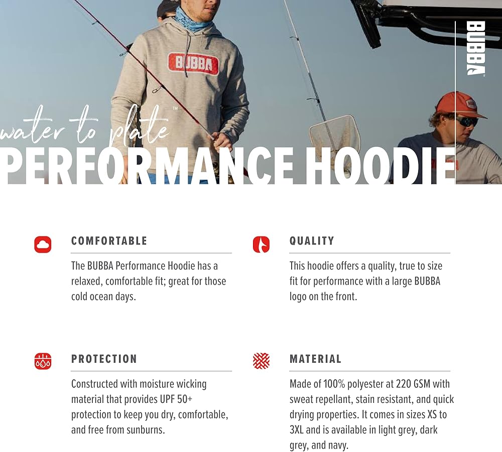 BUBBA apparel is for those who live the Ultimate Lifestyle with our focus on performance style and comfort. Combat against that cool ocean breeze during those early morning runs and those gusty days on the water. The BUBBA Performance Hoody is designed to keep you warm on those cold ocean days and wick away moisture with its sweat repelling material. This performance hoody will keep you comfortable as you seek out your next adventure. This 100% polyester performance hoody is for the everyday angler from deep sea to flats, boat to shore, and Water to Plate. BUBBA adheres to the highest standard of superior quality while delivering on our values: determined, authentic, adventurous, pioneering, and boundless. BUBBA offers the following colorways for the Ultimate Lifestyle Pullover Hoody: light grey, dark grey heather, and Carolina blue heather.