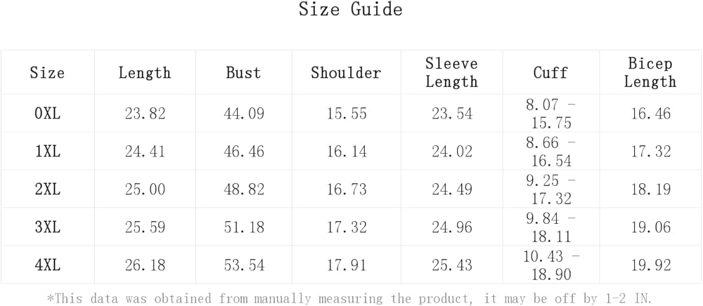 3X-Large Plus: Bicep Length: 19.1", Bust: 51.2", Cuff: 9.8-18.1", Length: 25.6", Shoulder: 17.3", Sleeve Length: 25.0"