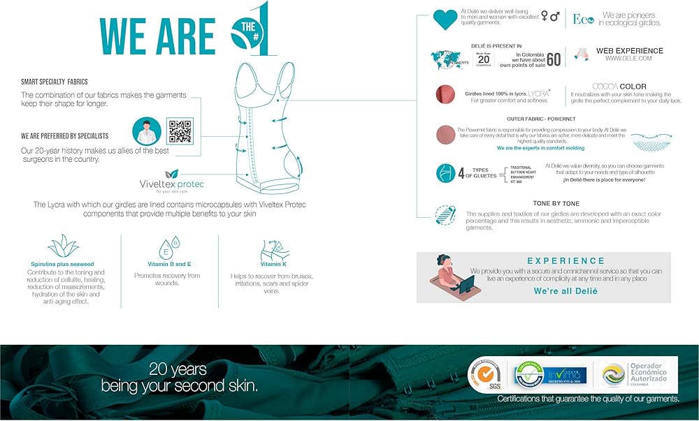 High compression 100% lycra lined Viveltex components: vitamin K, e, seaweed and spirulina. Flat and smooth seam design for added subtlety. Improve posture. Body molding in a uniform and natural way. Ultra buttock enhancement