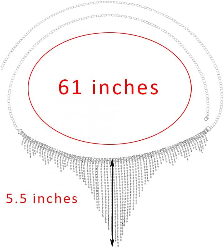 - المقاس: محيط سلسلة الخصر الكريستالية اللامعة 61 بوصة. يبلغ عرض جزء حجر الراين 13.7 بوصة والطول العمودي 5.5 بوصة بينما يبلغ طول جزء السلسلة 47.3 بوصة.