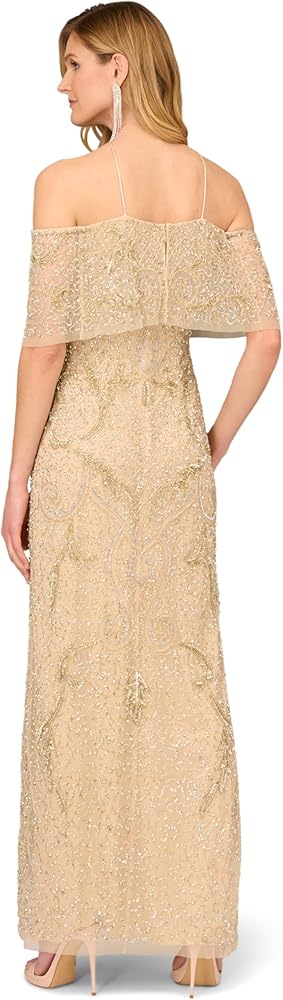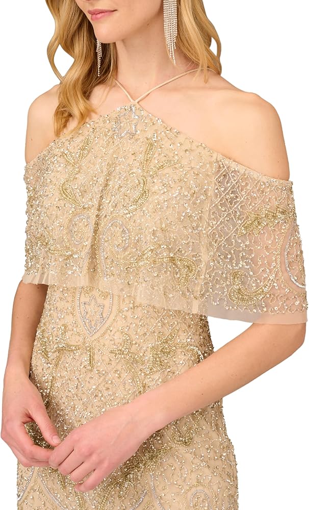 DonÂ't just shine on your next evening out - bring the drama with this elegant evening gown. This beaded dress features a column silhouette, halter neckline, and a fluttering popover detail at the bodice that shows off the shoulders and contrasts the fitted design. Fully lined, this eveninggown has a sweet mesh overlay that is adorned with a delightful mix of sequins and beading in an art nouveau design that accentuates the figure. A zipper back closure finishes this flutter sleeve dress. Matching neutral high heels and a beaded clutch are the perfect additions to thiscold shoulder dress.